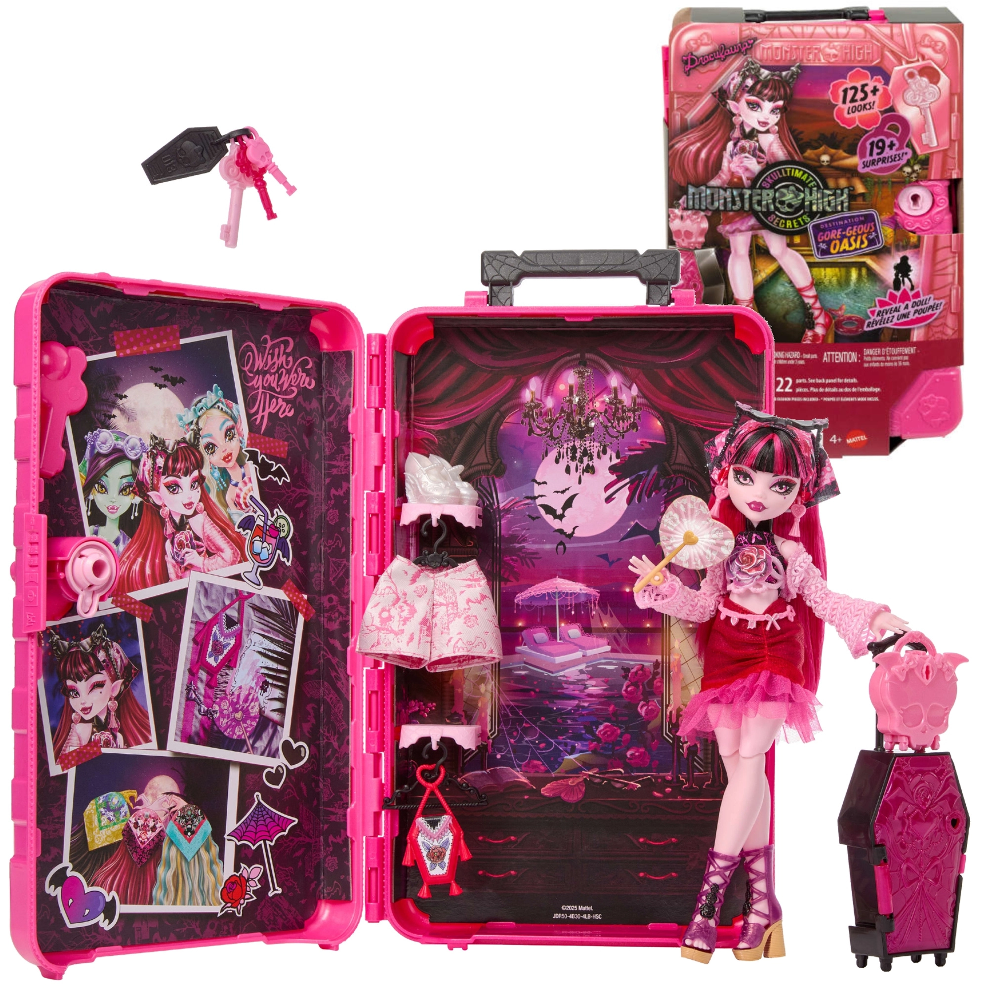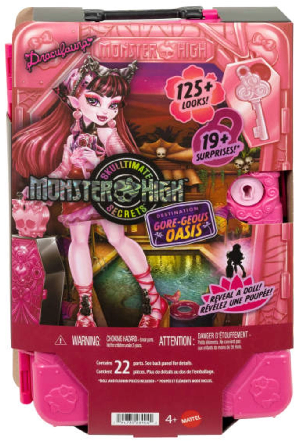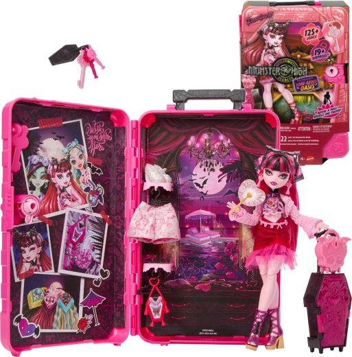 Die Puppe Draculaura aus der Reihe Monster High Spukgeheimnisse lädt Kinder in die Welt der vampirischen Mode und des Reisens ein. Der große rosa-schwarze Rollkoffer lässt sich öffnen und verbirgt innen Haken, Regale sowie Platz zur Aufbewahrung von Outfits und Accessoires. Sucht nach drei Schlüsseln, öffnet Fächer und entdeckt neue Teile – von Brille und Bandana bis hin zu Fächer und Schuhen.