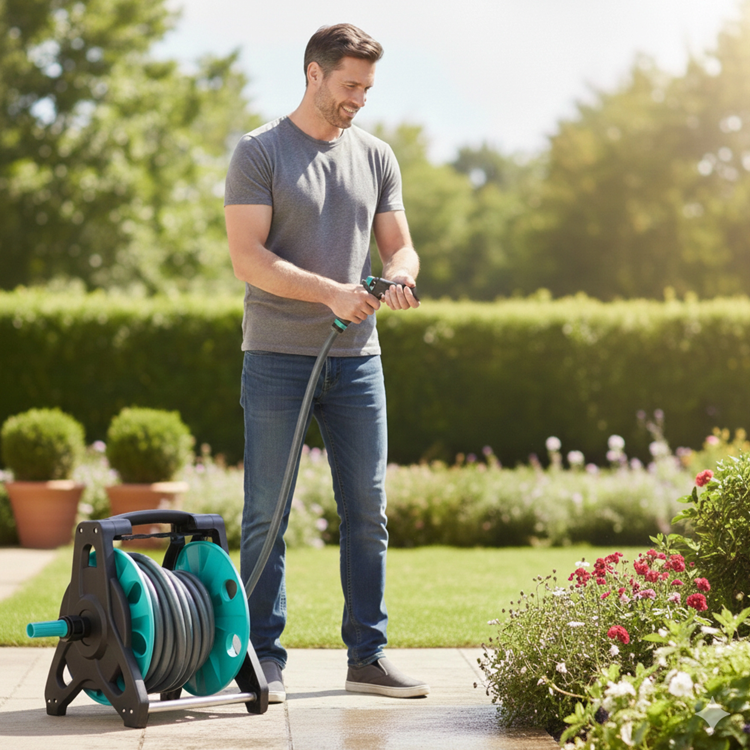 Alles für den sofortigen Einsatz ist enthalten: 2 m Zulaufschlauch, Schnellkupplungen, Adapter sowie Wasserhahnanschluss. Der Aufwickler hält den Schlauch frei von Verdrehen und Abknicken – für schnelleres, saubereres und effizienteres Bewässern.