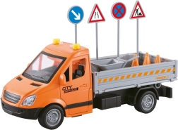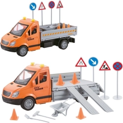 Zum Lieferumfang gehören Verkehrspylonen, Schilder, Barrieren und kleines Werkzeug, mit denen Kinder im Handumdrehen eine eigene Baustelle oder Straßensperre gestalten. Die robuste Kunststoffausführung ist sicher und für den täglichen Spielgebrauch geeignet.