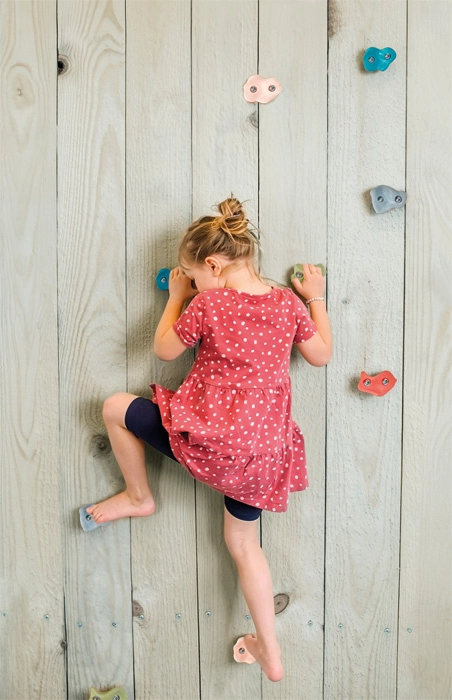 Dank der freien Anordnung lässt sich der Schwierigkeitsgrad leicht variieren – von einfachen Anfängerlinien bis zu anspruchsvolleren Herausforderungen für kleine Boulderer. Klettern fördert auf natürliche Weise Kraft, Ausdauer, Koordination und Selbstvertrauen und unterstützt die gesunde motorische Entwicklung von Kindern.