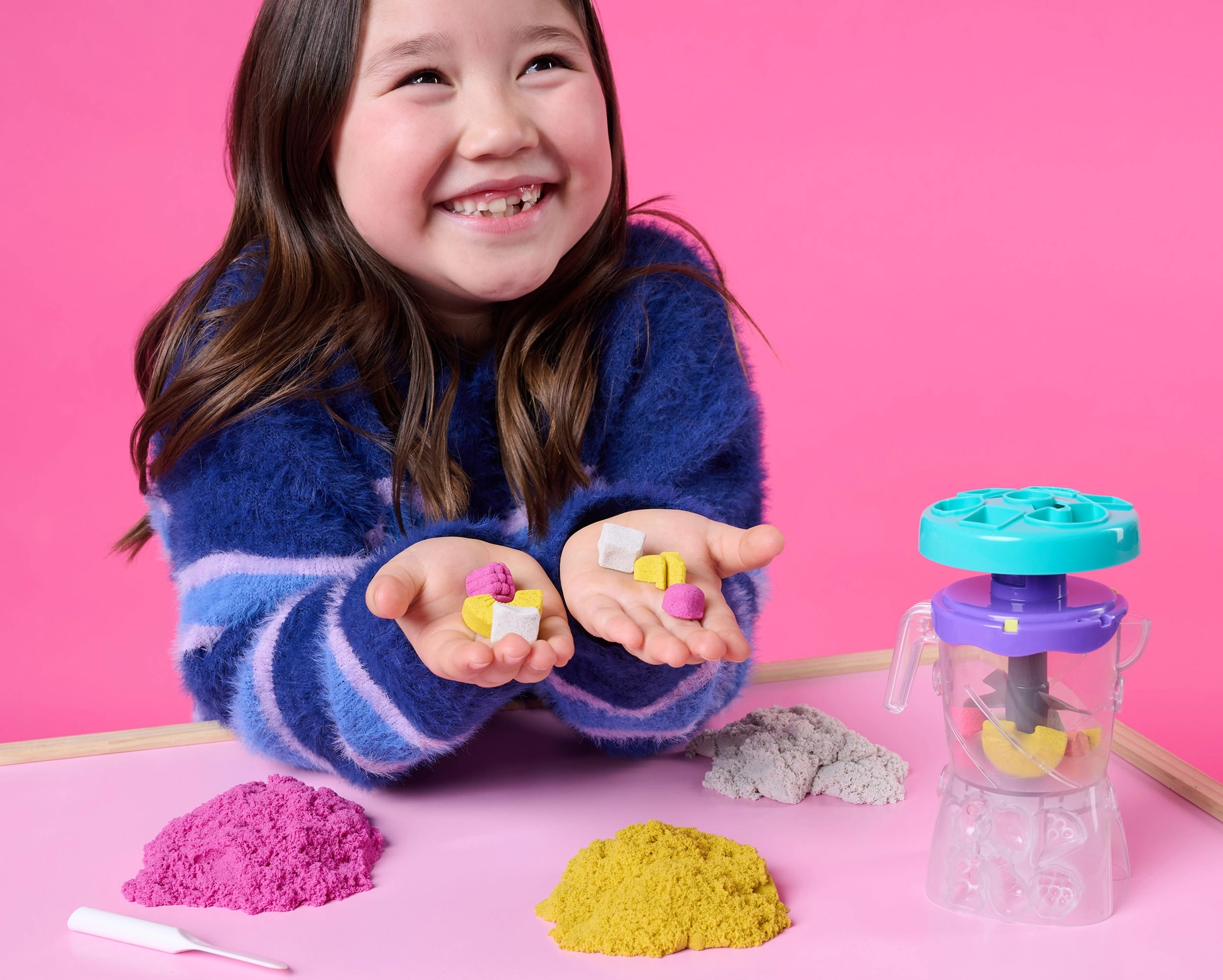 Mit dem Kinetic Sand Smoothie-Mixer lernen Kinder Farben zu mischen und „Getränke“ sowie „Desserts“ in Bechern oder Eisformen zu schichten. Einfach Sand in den Deckel des Mixers füllen, von Hand kurbeln und beobachten, wie neue Farbtöne und realistische Texturen entstehen. Der kinetische Sand wirkt wie nass, doch die Hände bleiben trocken und die Arbeitsfläche sauberer.