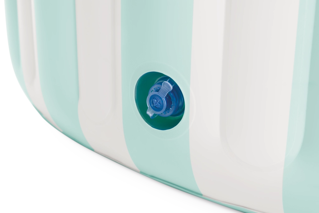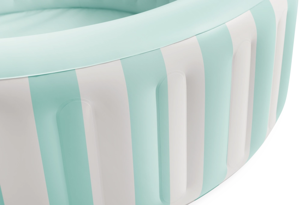 Das aufblasbare Planschbecken Coastal Luxe im modernen, maritimen Design ist ideal für sommerliche Wasserspiele kleinerer Kinder. Vertikale Streifen in hellem Türkis und Weiß wirken frisch, während die glatte Innenfläche in zartem Türkis ein Gefühl von Reinheit und Ruhe vermittelt. Robustes PVC und mehrkammerige Wände bieten Stabilität und Komfort beim Sitzen und Spielen.