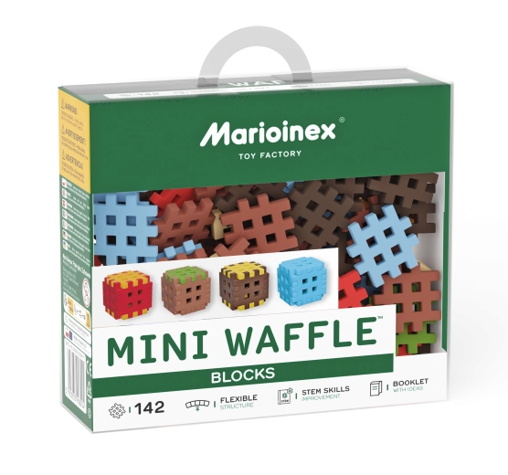 Das Mini Waffle Blocks Set bietet 142 farbige Teile, inspiriert von der Natur – braune „Erde“, grünes „Gras“, eisig-blaue Elemente und energische Rot-Gelb-Akzente. Dank des weichen und flexiblen Materials liegen die Bausteine angenehm in der Hand und lassen sich auch von jüngeren Kindern leicht verbinden.