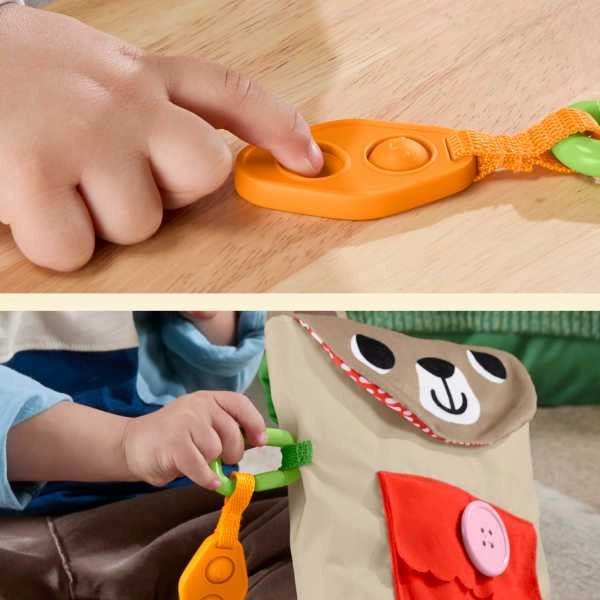 Drücke den Clip, schließe die Tasche, biege den „knusprigen“ Snack und klebe die Stoffpflaster mit Klettverschluss auf – jede Aktivität stärkt Koordination und Geschicklichkeit.
