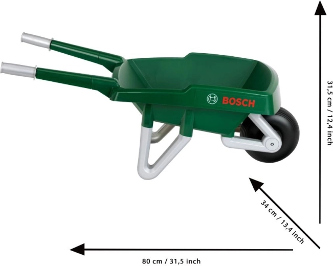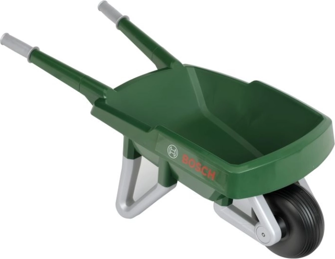 Die Schubkarre hat eine tiefe Mulde in Dunkelgrün, ein vorderes laufendes Rad für geschmeidiges Fahren und zwei Stützfüße für stabiles Abstellen. Ergonomische Griffe passen perfekt in kleine Kinderhände und fördern Motorik und Fantasie beim Spielen als kleiner Gärtner.