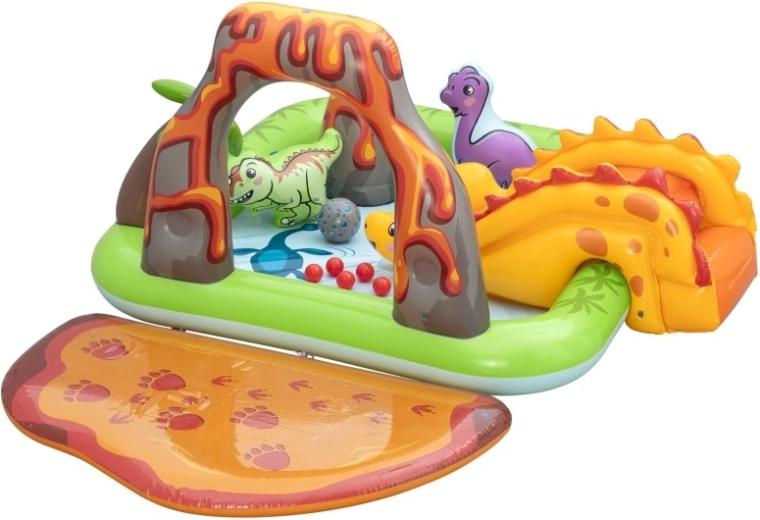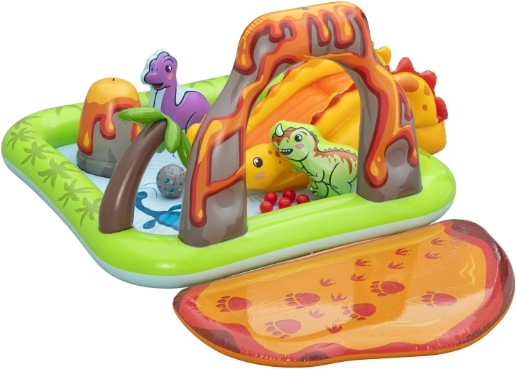 Rutsche mit Landekissen, Wasser-Spielmatte, Dinosaurier-Figuren, vulkanischer Bogen mit Ballöffnung