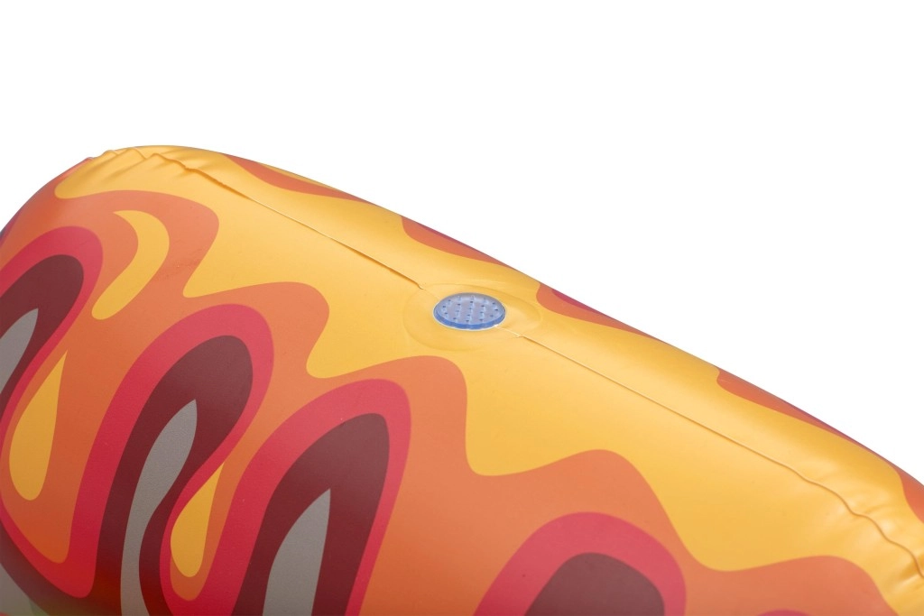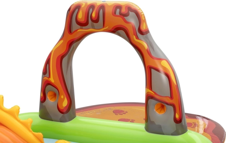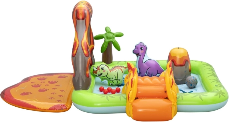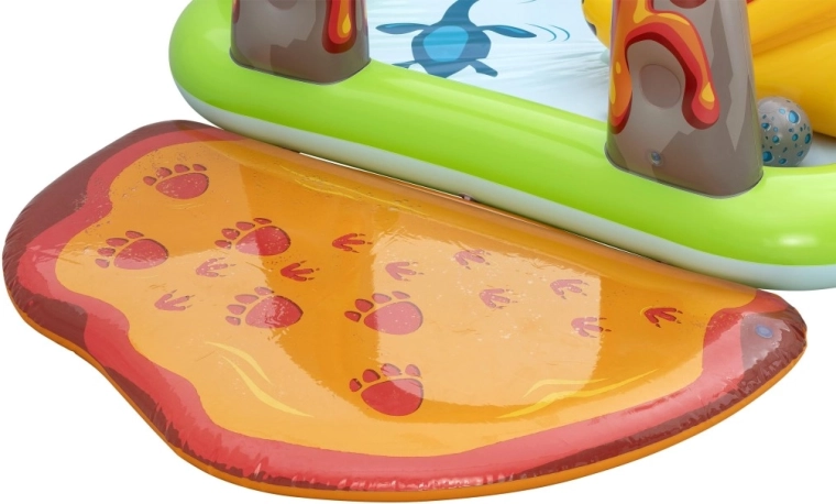 Zum Set gehören ein gelber Dinosaurier mit Rutsche, aufblasbare grüner und lilafarbener Dinosaurier als Spielfiguren, eine Öffnung im „Vulkan“ zum Bällewerfen sowie ein weiches Landekissen für eine sichere Ankunft. Dank hochwertigem Vinyl, glatter Nähte und abgerundeter Kanten ist das Spielen bequem und sicher. Schnelles Aufblasen, einfaches Ablassen und das beiliegende Reparaturflicken erleichtern Pflege und Aufbewahrung.