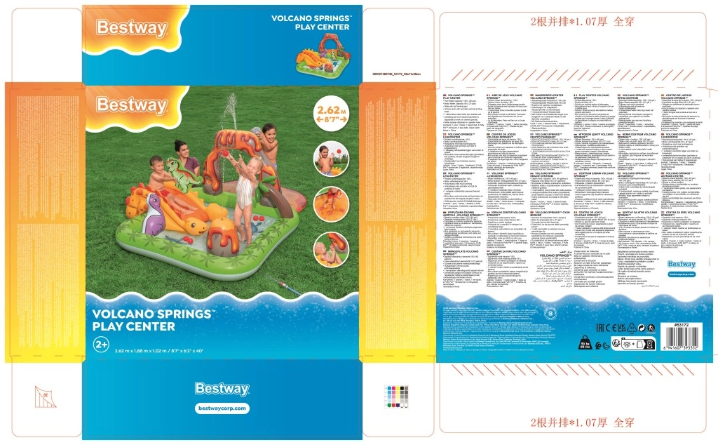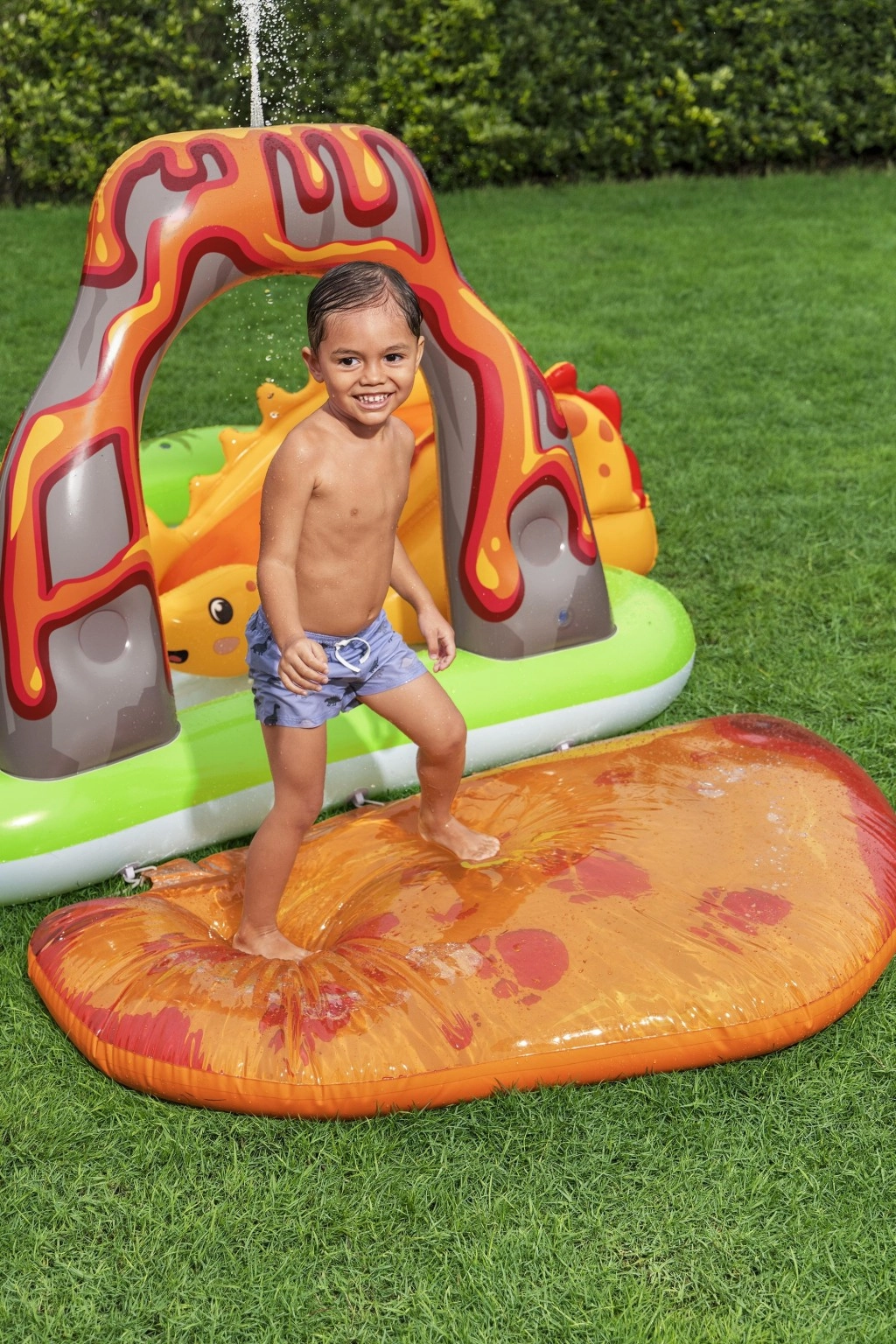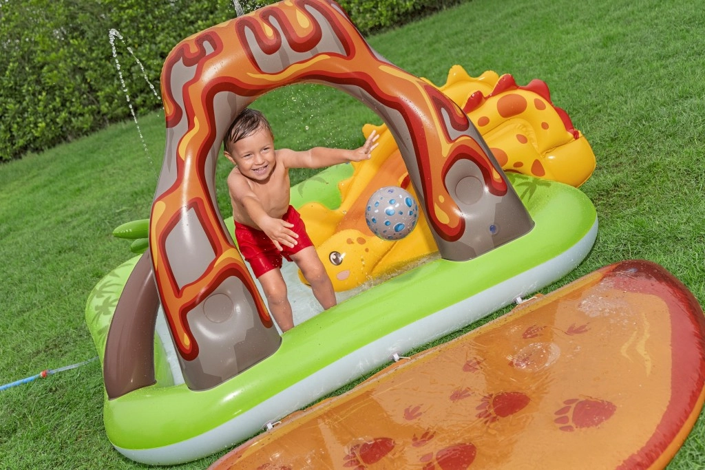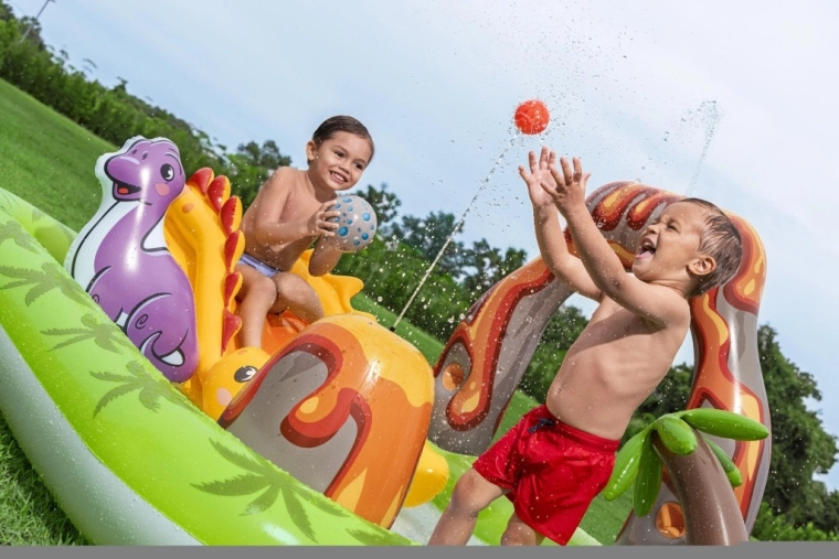 Starten Sie in den Sommer mit diesem farbenfrohen aufblasbaren Spielcenter im Dinosaurier-Design, das jeden Garten in einen kleinen Wasserpark verwandelt. Es bietet ein großzügiges Planschbecken 262 × 188 × 102 cm, eine weiche Rutsche mit Landekissen und einen Wassersprinkler, der an den Gartenschlauch angeschlossen werden kann. Kinder freuen sich über Dinosaurier-Figuren, einen vulkanischen Bogen mit Wurföffnung für Bälle und eine Wasser-Spielmatte für noch mehr Planschspaß. Robustes Vinyl sorgt für sicheres und langanhaltendes Spielvergnügen auch bei häufiger Nutzung.