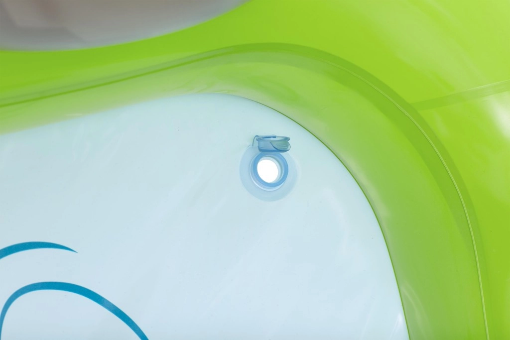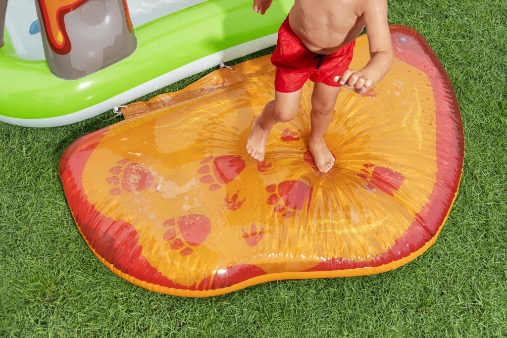 Das aufblasbare Spielcenter mit Dinosauriern ist die ideale Wahl für aktiven Sommerspaß für Kinder ab 2 Jahren. Das grüne Becken mit Palmenaufdruck und blauem Boden fasst ca. 150 l Wasser, während die separate Wasser-Spielmatte mit Lava-Motiv weitere 80 l aufnimmt – für eine weiche Landung und fröhliches Hüpfen. Den integrierten Sprinkler am vulkanischen Bogen schließen Sie einfach an den Gartenschlauch an und erzeugen im Handumdrehen eine erfrischende Dusche.