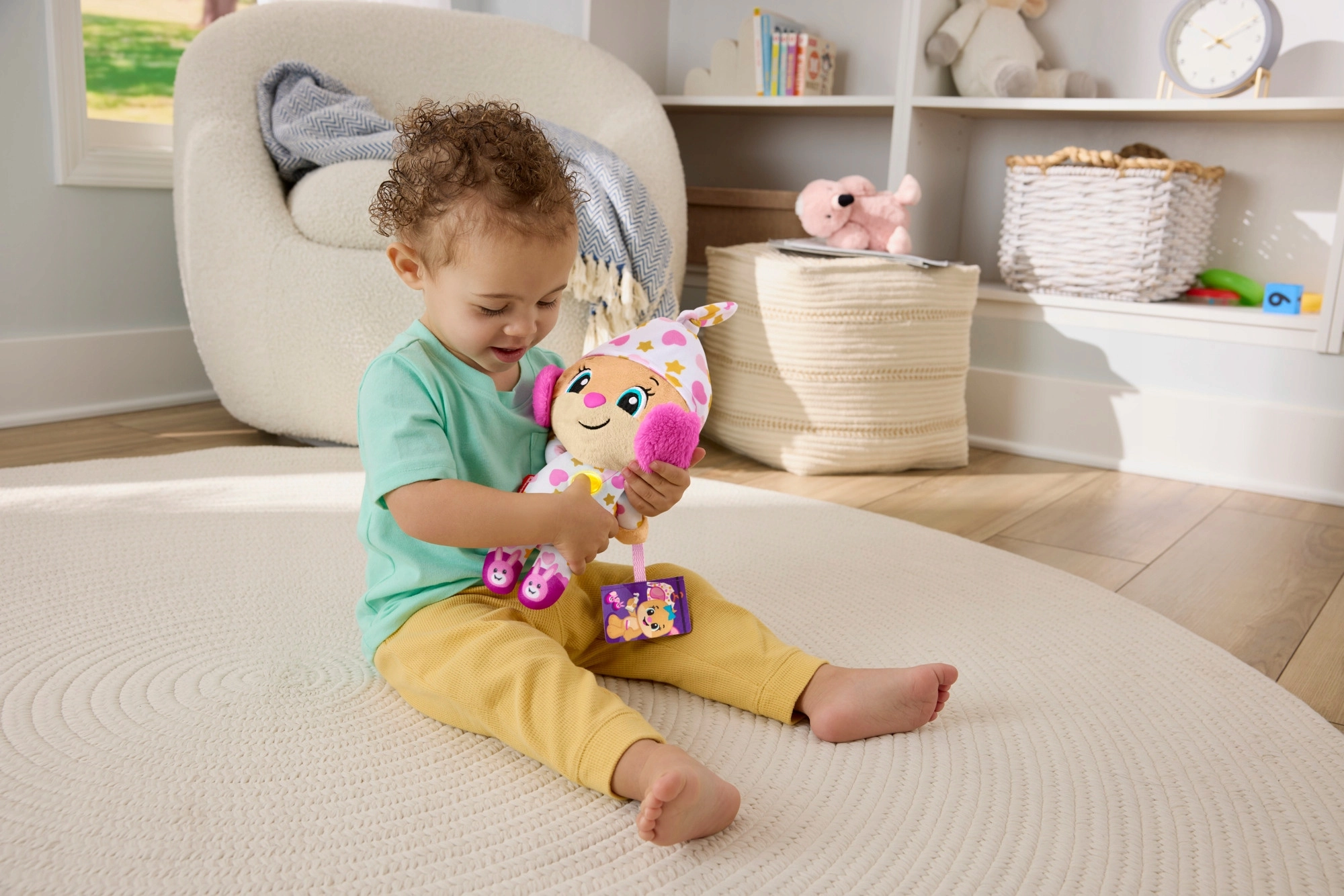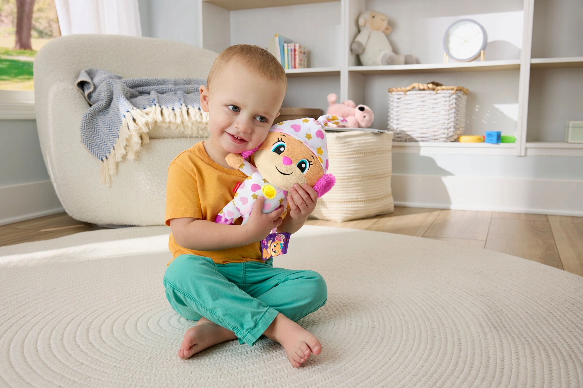 Die interaktive Plüschfigur Lerne und Lache! ist der ideale Begleiter für abendliche Rituale und ruhige Momente am Tag. Im Pyjama mit verspielten Mustern und einem leuchtenden Herzchen schafft sie eine angenehme Atmosphäre zum Runterkommen, Entspannen und Einschlafen.