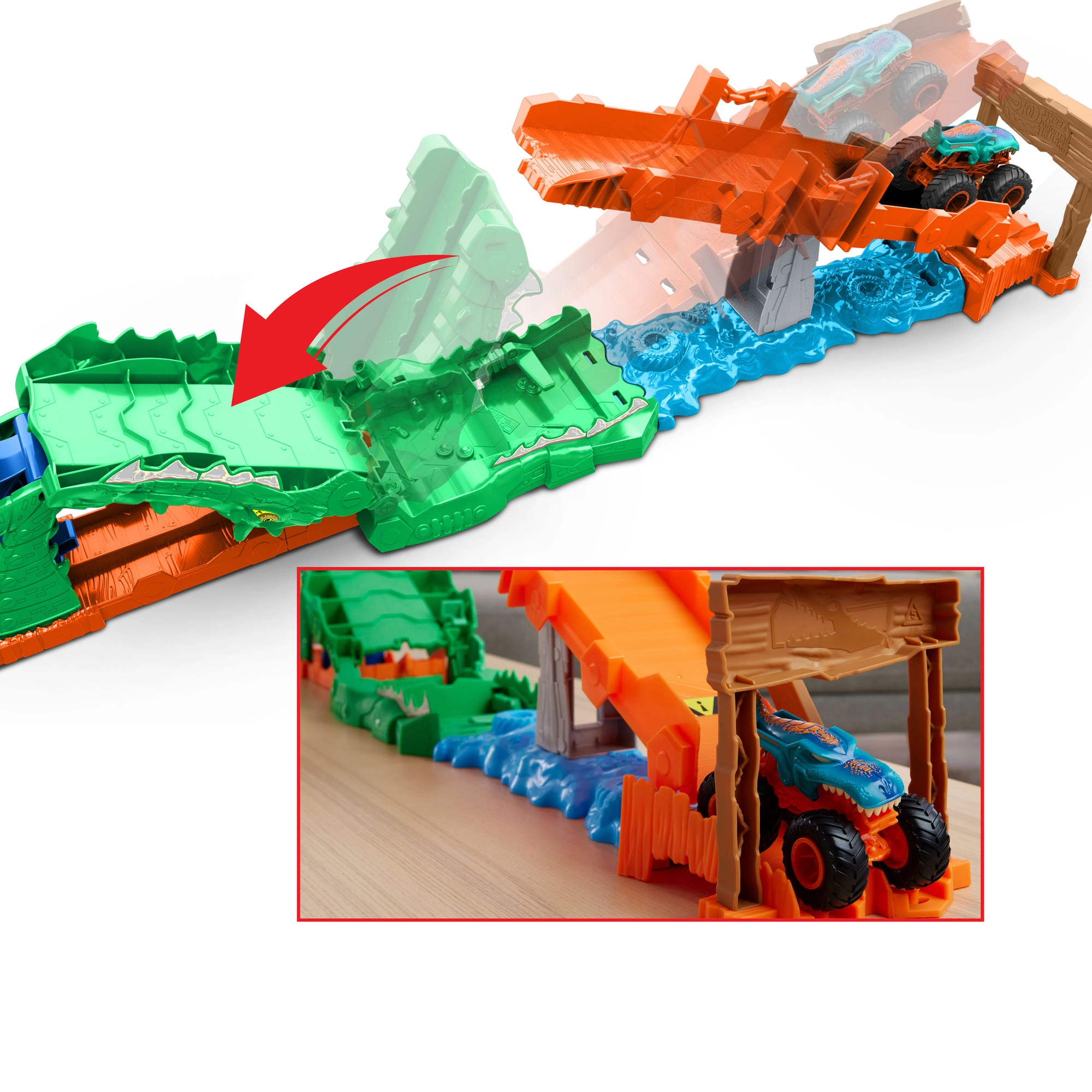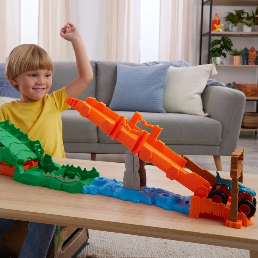 Dieses farbenfrohe Stuntset verbindet Action, Spannung und kreatives Spiel. Schieße Mega Wrex die orangefarbene Rampe hinauf, bezwinge die Fallbrücke und versuche, über das hungrige Krokodil zu springen – oder du landest direkt in seinem Maul. Das Ergebnis hängt von der Abschusskraft ab, dadurch ist jede Fahrt anders und Kinder trainieren Koordination und Einschätzung.