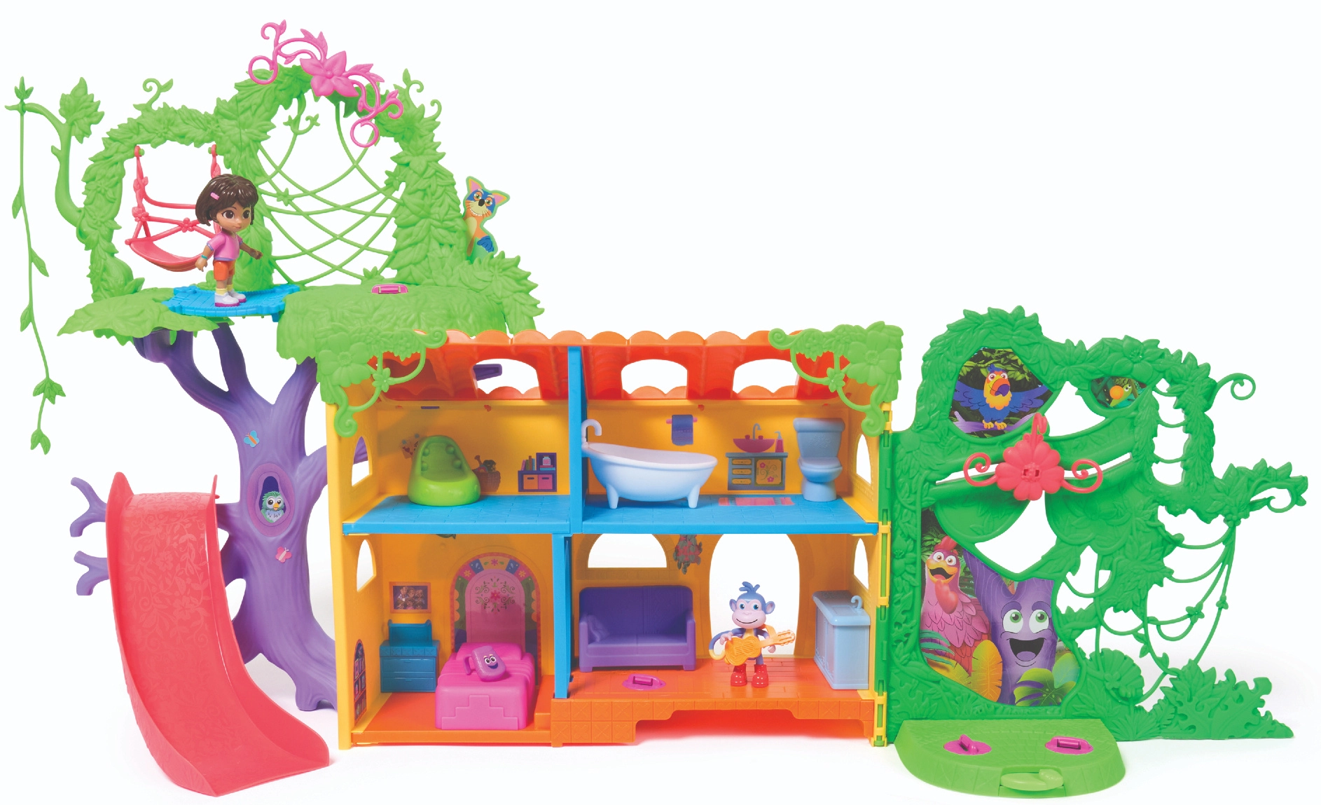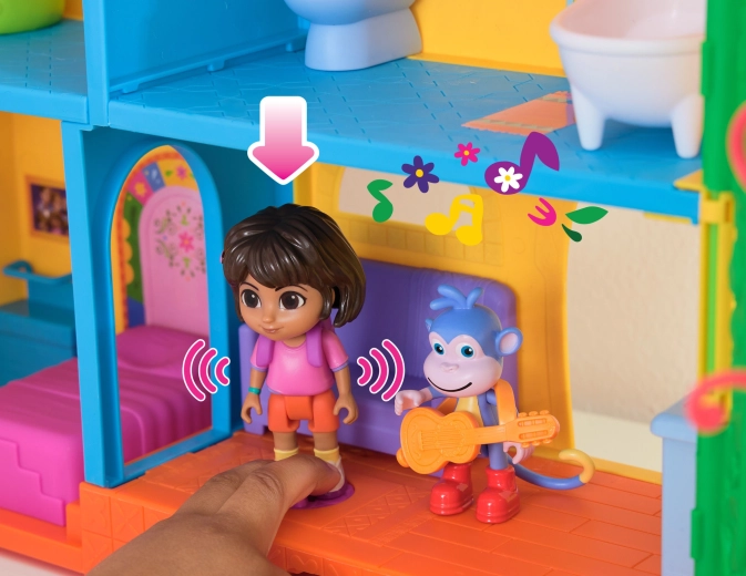 Betritt das farbenfrohe Dschungelhaus, inspiriert von der Serie Dora die Entdeckerin, und brich zu Abenteuern auf. Der Innenbereich bietet mehrere detailreich gestaltete Zimmer mit Möbeln (z. B. Sofa, Badewanne), während der Außenbereich mit Attraktionen in den Baumkronen begeistert. Mit einem einzigen Druck auf die Taste im Wohnzimmer startest du Soundeffekte und Musik, die interaktives Lernen und Spielspaß fördern.