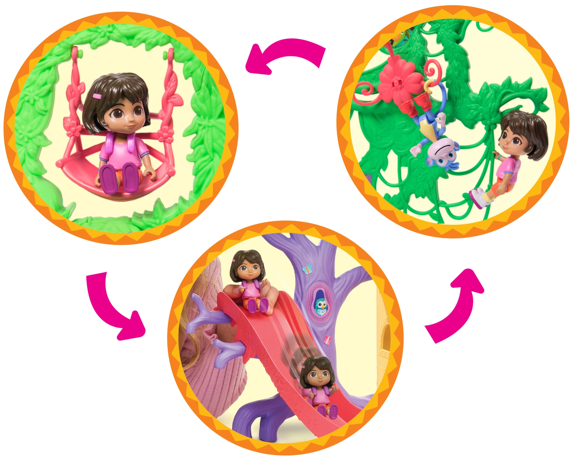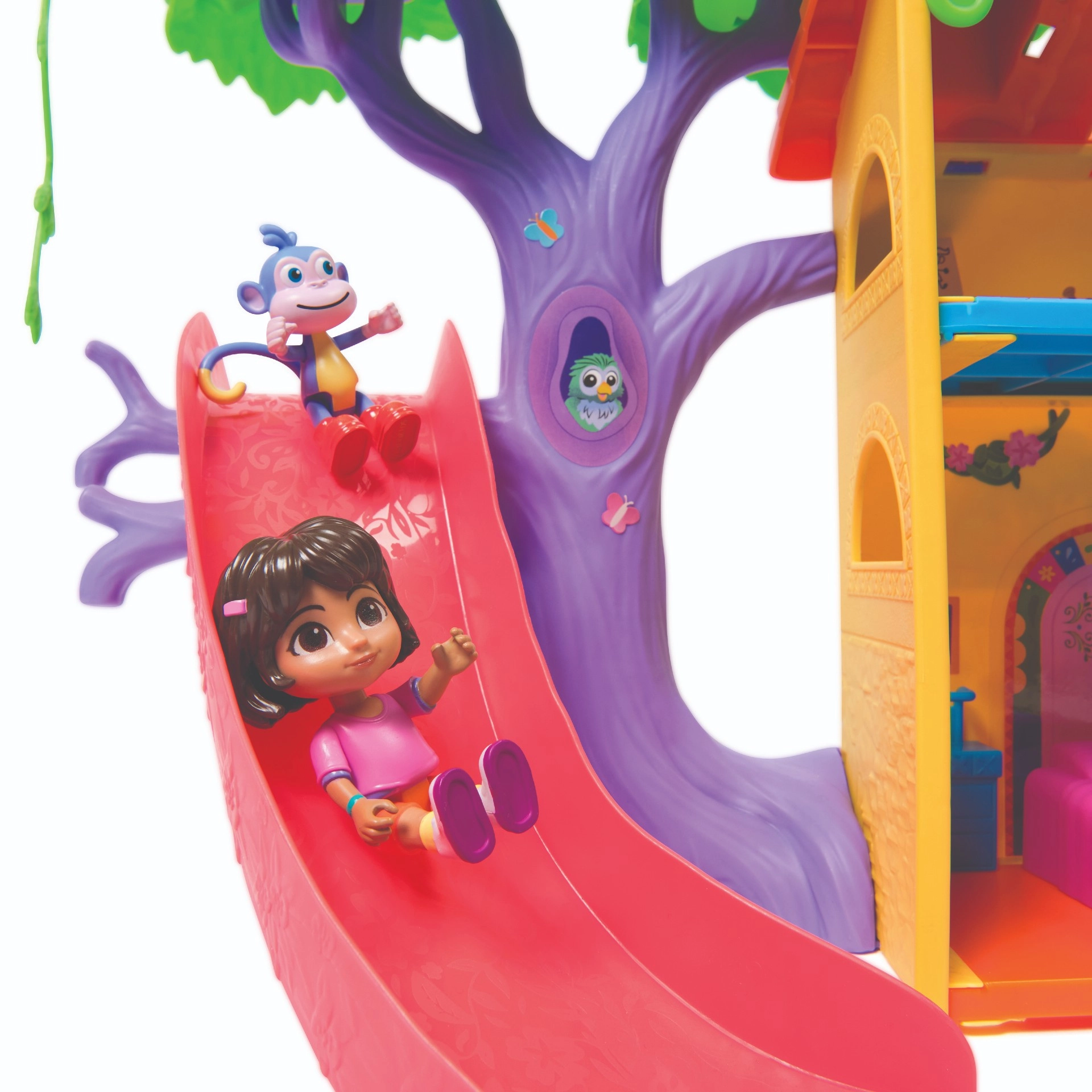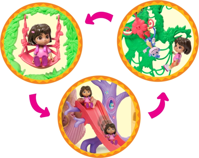 Das Spielset unterstützt die Entwicklung der Vorstellungskraft, Rollenspiele und kreatives Denken. Kinder können klettern, rutschen, schaukeln und mit ihren Lieblingshelden eigene Geschichten erzählen. Im Set enthalten sind eine Dora-Figur, eine Boots-Figur, der ikonische Rucksack, 6 Möbelstücke und eine Sammelkarte.