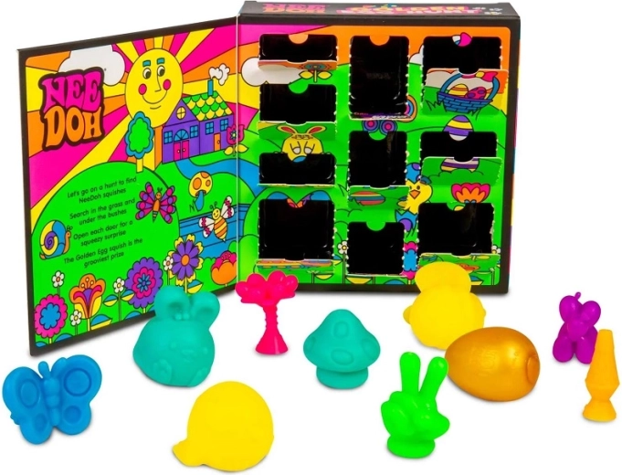 Holen Sie den Zauber der Ostereiersuche nach Hause. Eine aufklappbare Box mit geheimen Türchen verbirgt 10 quetschbare Teenie NeeDoh-Überraschungen – Häschen, Bienen, Blumen und weitere Frühlingsformen. Mit dabei ist auch das besondere goldene Ei, der seltenste Schatz des gesamten Sets. Jede Figur ist weich, dehnbar und angenehm zu berühren – perfekt zum Quetschen und Ziehen als Anti-Stress-Helfer.