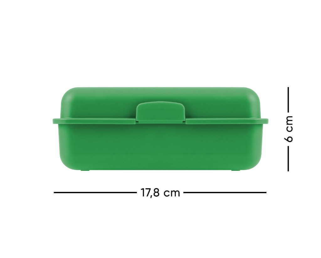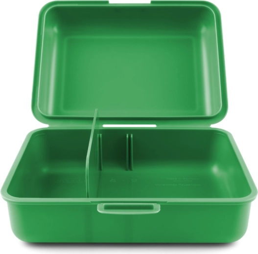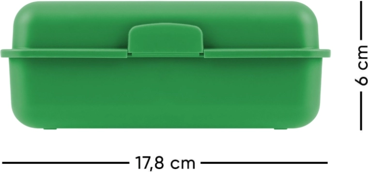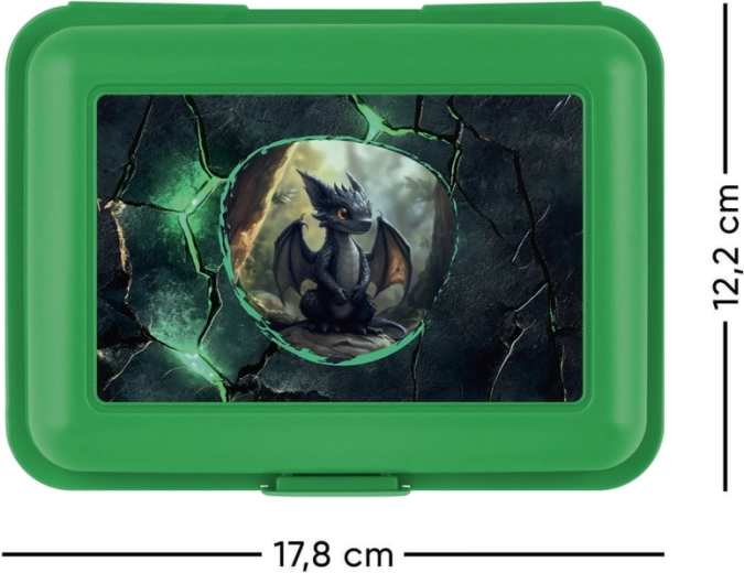 Praktische Brotzeitbox von Baagl mit dem Motiv Drachen – ideal für Schule und Ausflüge. Die robuste Kunststoffbox in grüner Farbe verfügt über einen zuverlässigen Verschluss mit einem Riegel und eine Trennwand zur übersichtlichen Aufteilung der Lebensmittel. Pflegeleicht, dennoch nicht für die Spülmaschine empfohlen.