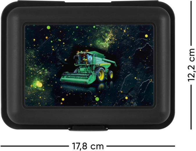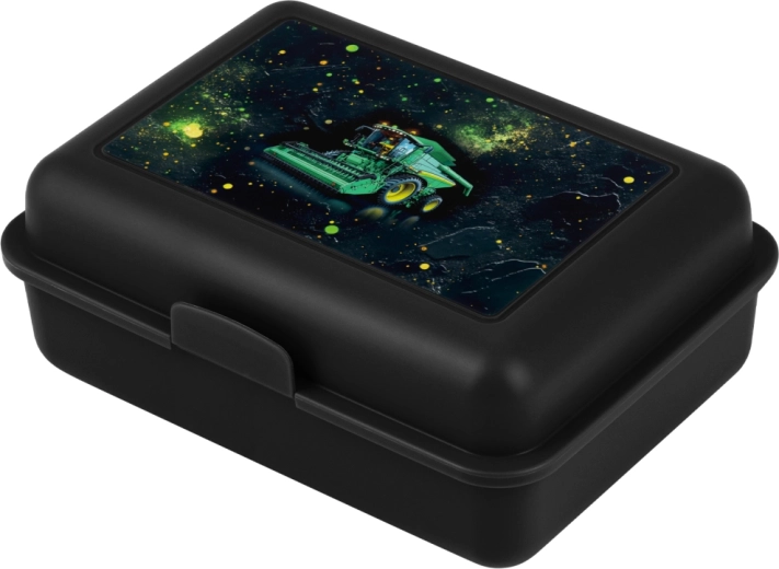 Praktische Brotdose der Marke Baagl mit Traktor-Motiv in elegantem schwarzem Farbton. Bietet sicheres Verschließen mit einem Riegel und eine innere Trennwand für eine bessere Organisation der Jause. Für eine längere Lebensdauer nicht für die Spülmaschine empfohlen.