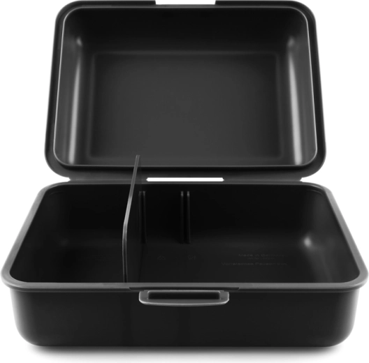 Dank der Trennwand trennen Sie bequem Obst, Gebäck oder kleine Snacks. Der Verschluss mit einem Riegel sorgt dafür, dass sich die Dose beim Transport nicht öffnet. Zur Wahrung der Material- und Druckqualität wird das Reinigen in der Spülmaschine nicht empfohlen.