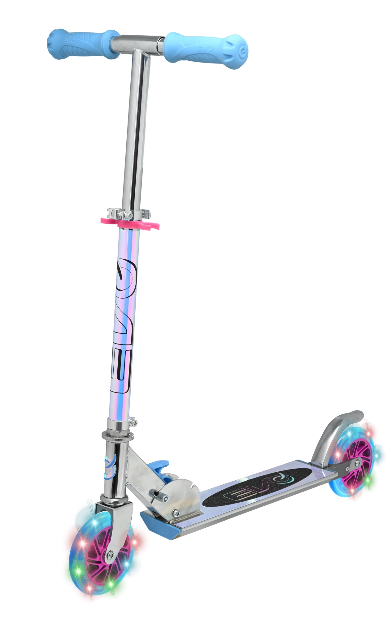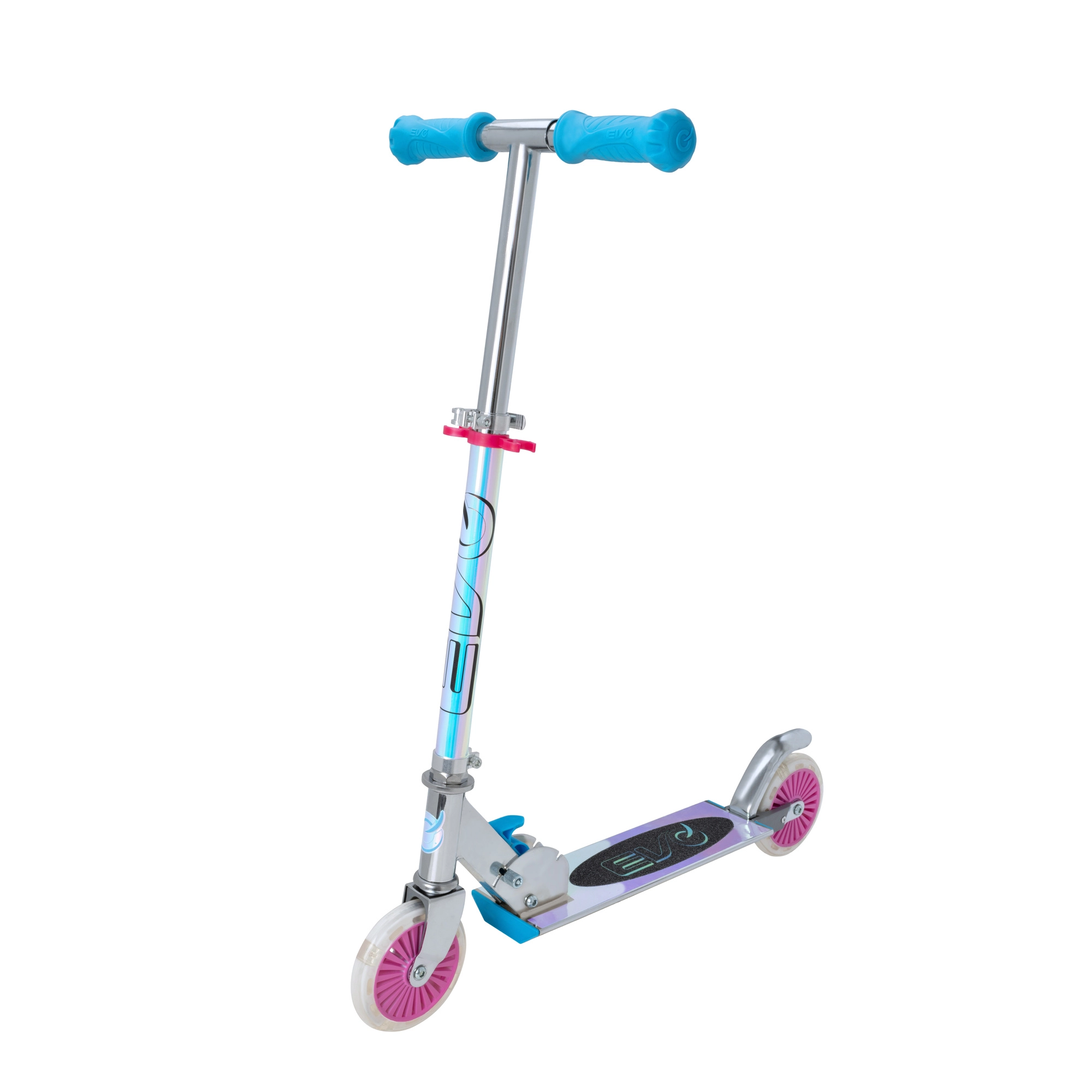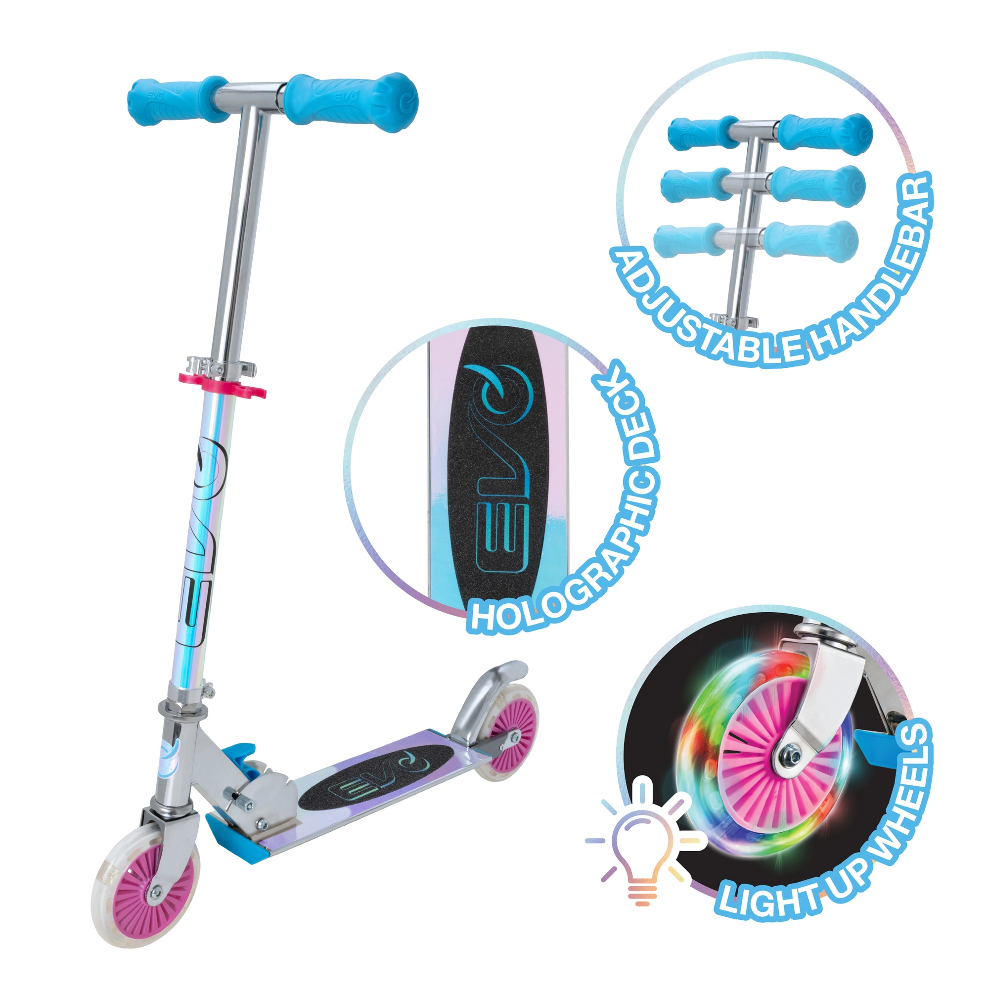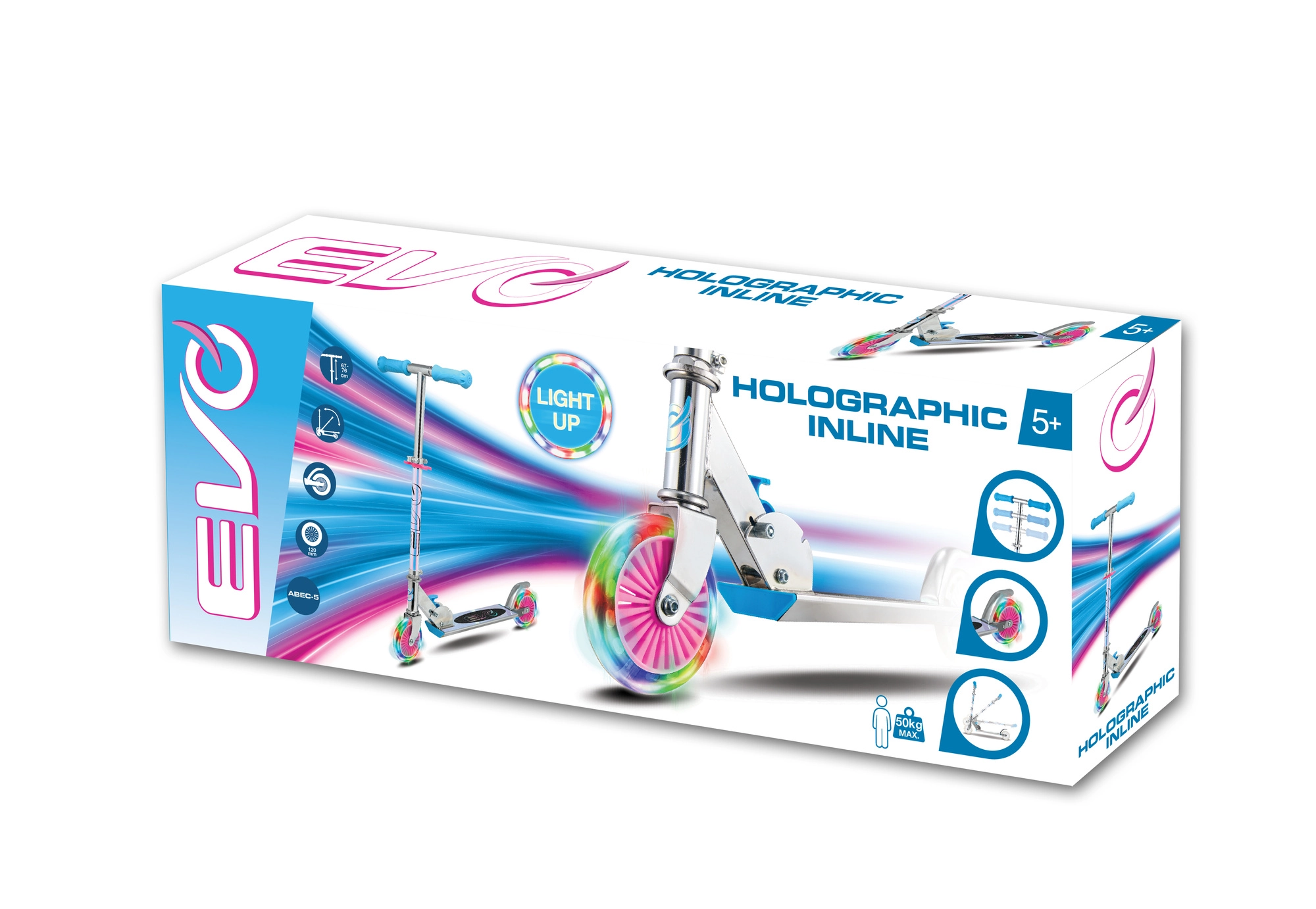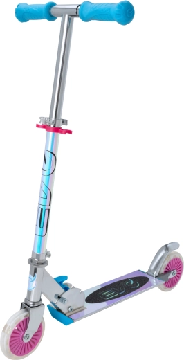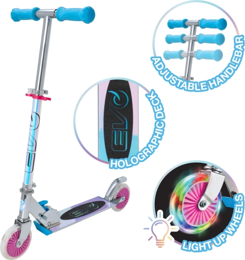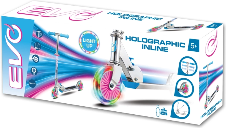 Der EVO Holographic Inline Roller verbindet Spaß und Sicherheit. Dank der leuchtenden LED-Räder ist jede Fahrt attraktiv, während die höhenverstellbare Lenkstange (ca. 67–77 cm) eine bequeme Anpassung an das Wachstum des Kindes ermöglicht. Die klappbare Konstruktion erleichtert den Transport und die Aufbewahrung zu Hause oder im Kofferraum.