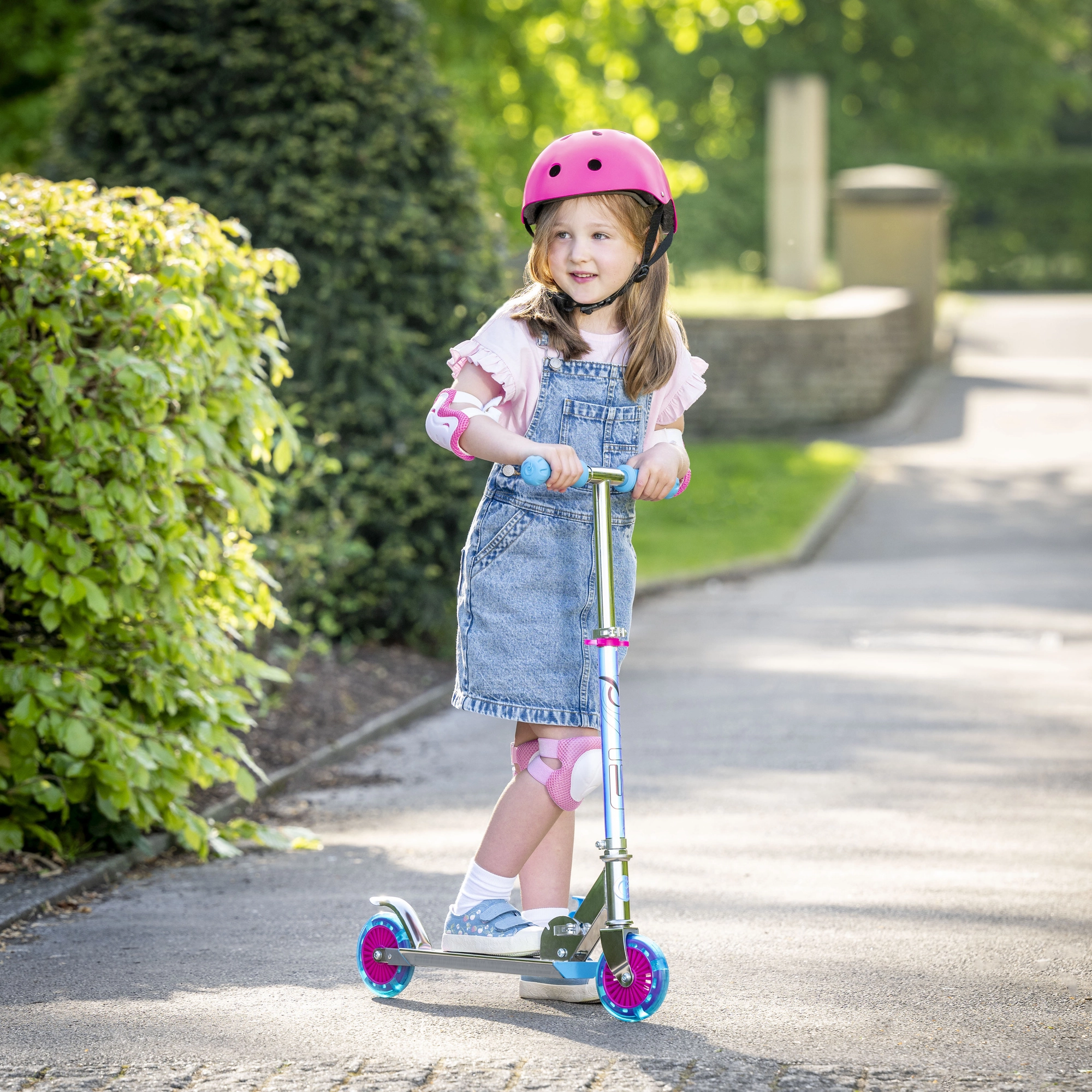 Die Fahreigenschaften werden durch Gummiräder mit ABEC-5-Lagern für eine leise und sanfte Freizeitfahrt verbessert. Der hintere Kotflügel dient als Trittbremse und bietet zuverlässiges Abbremsen. Der Roller ist ideal für Kinder ab 5 Jahren und fördert Gleichgewicht, Koordination und gesunde Bewegung.