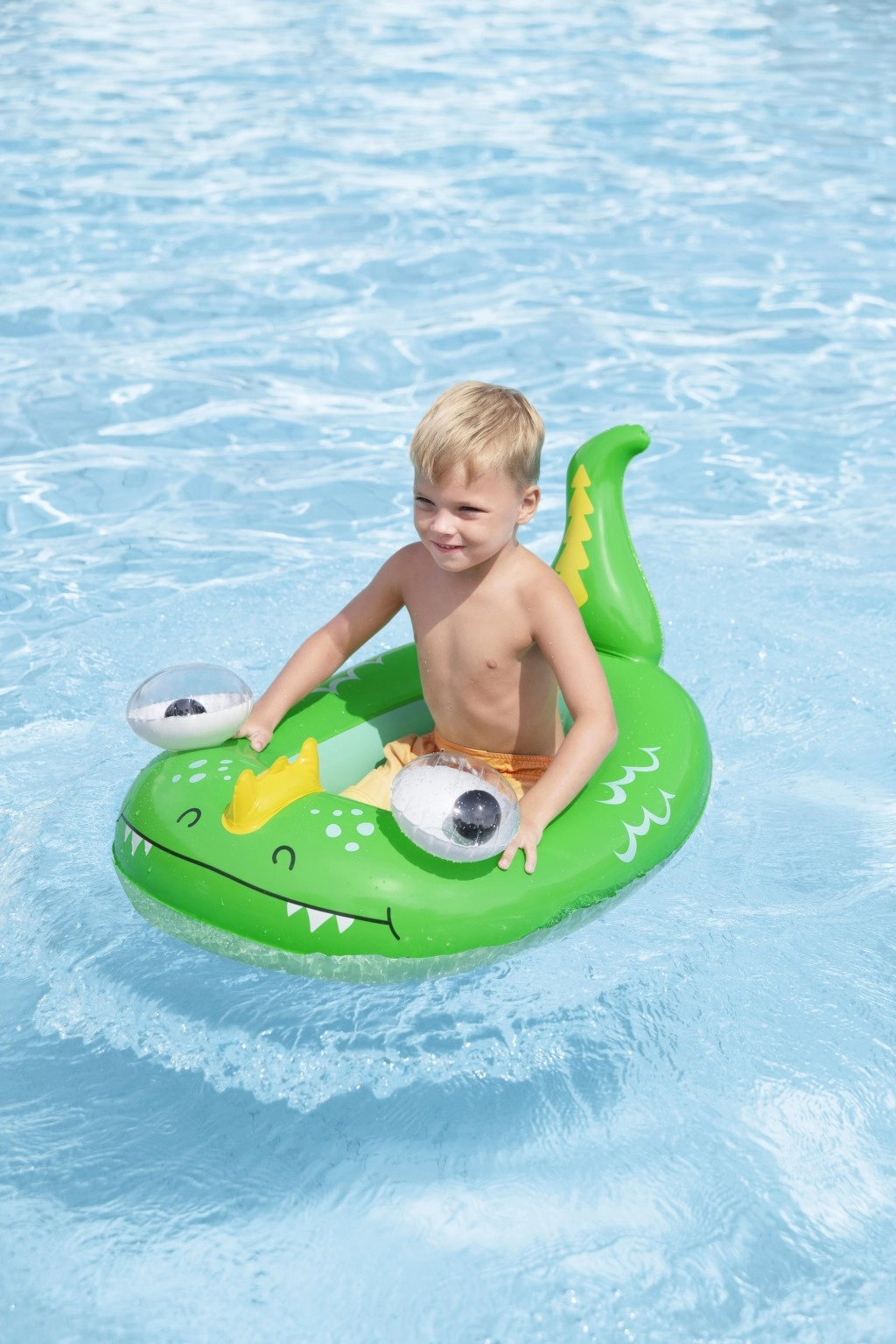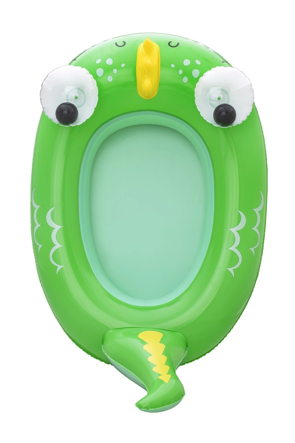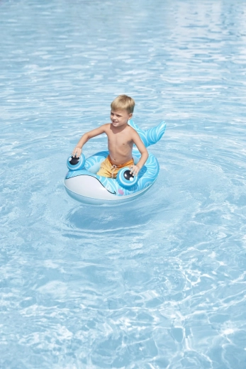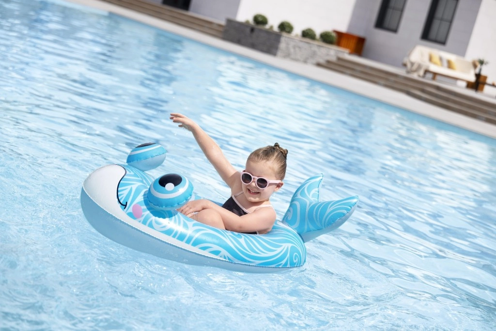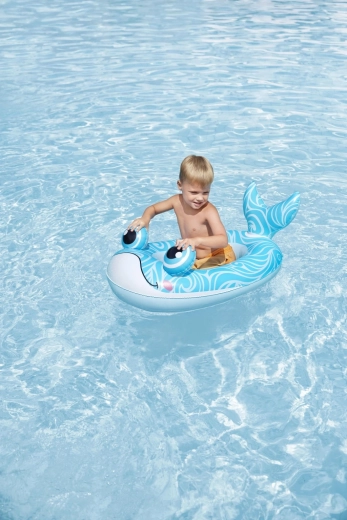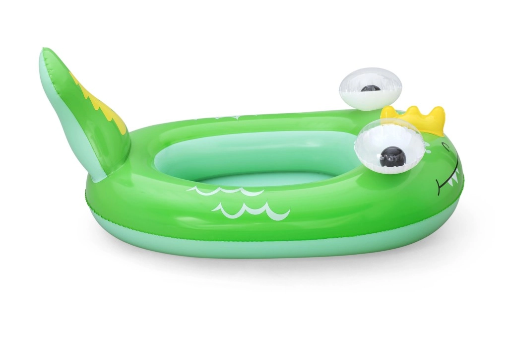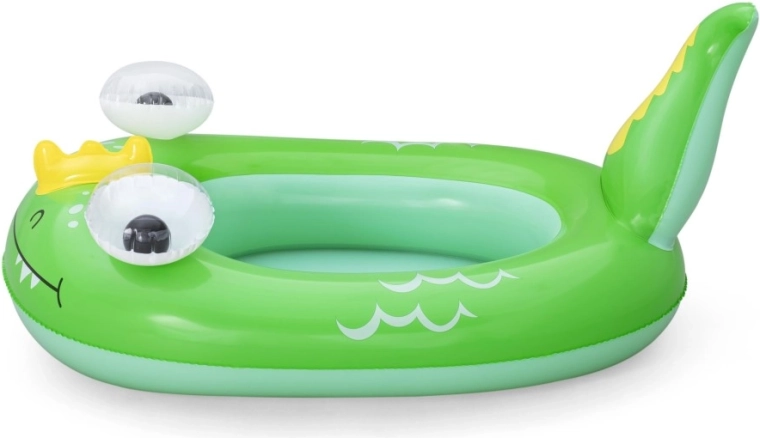 Jedes Motiv bietet eigene verspielte Details: ein blauer Wal mit weißen Spiralen und 3D‑Augen, ein grüner Drache mit ausdrucksstarken Augen und gelben Akzenten sowie ein gelb‑türkisfarbenes U‑Boot mit weißem Propeller für noch mehr Spaß. Sicherheitsventile ermöglichen schnelles Auf- und Ablassen der Luft – ideal für Familien unterwegs und fürs Wochenendbaden.