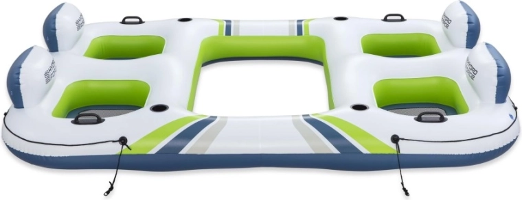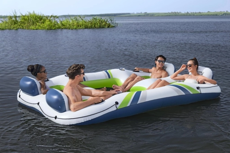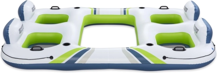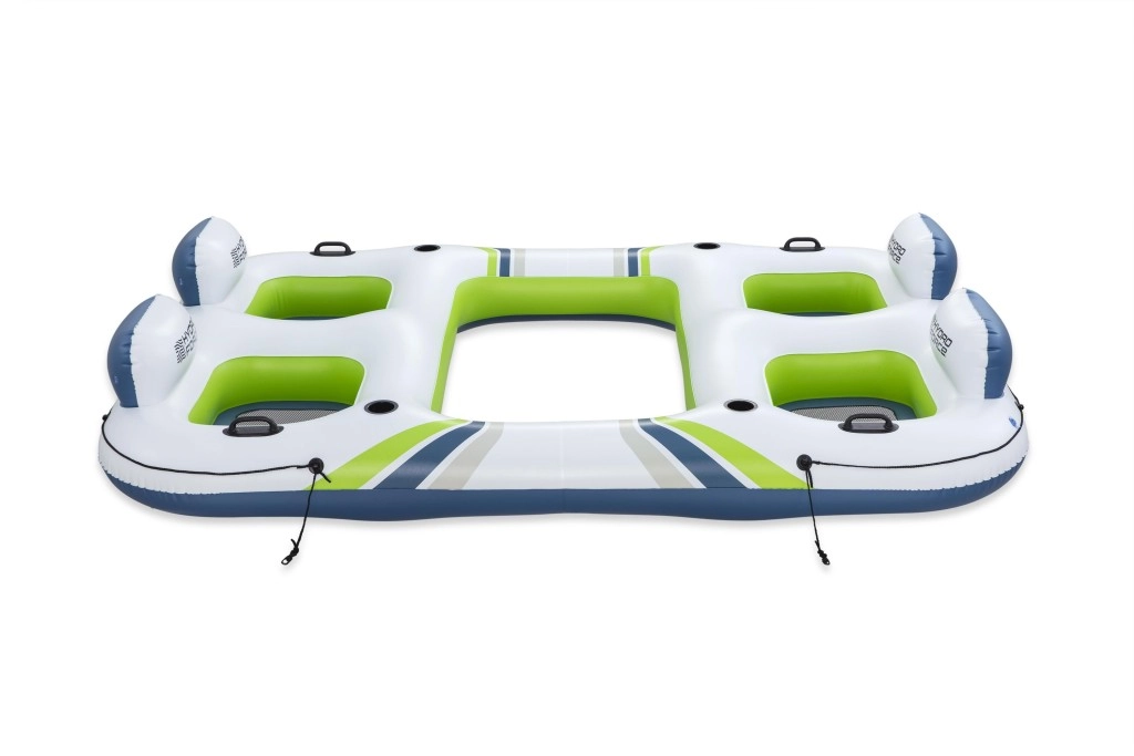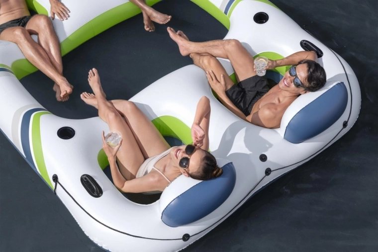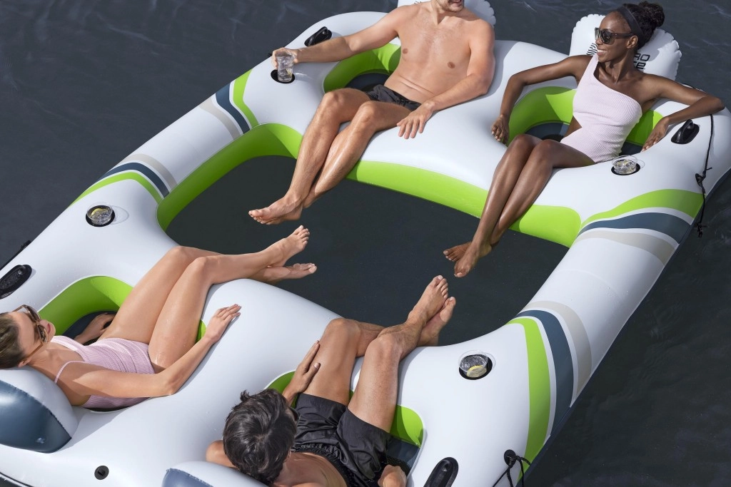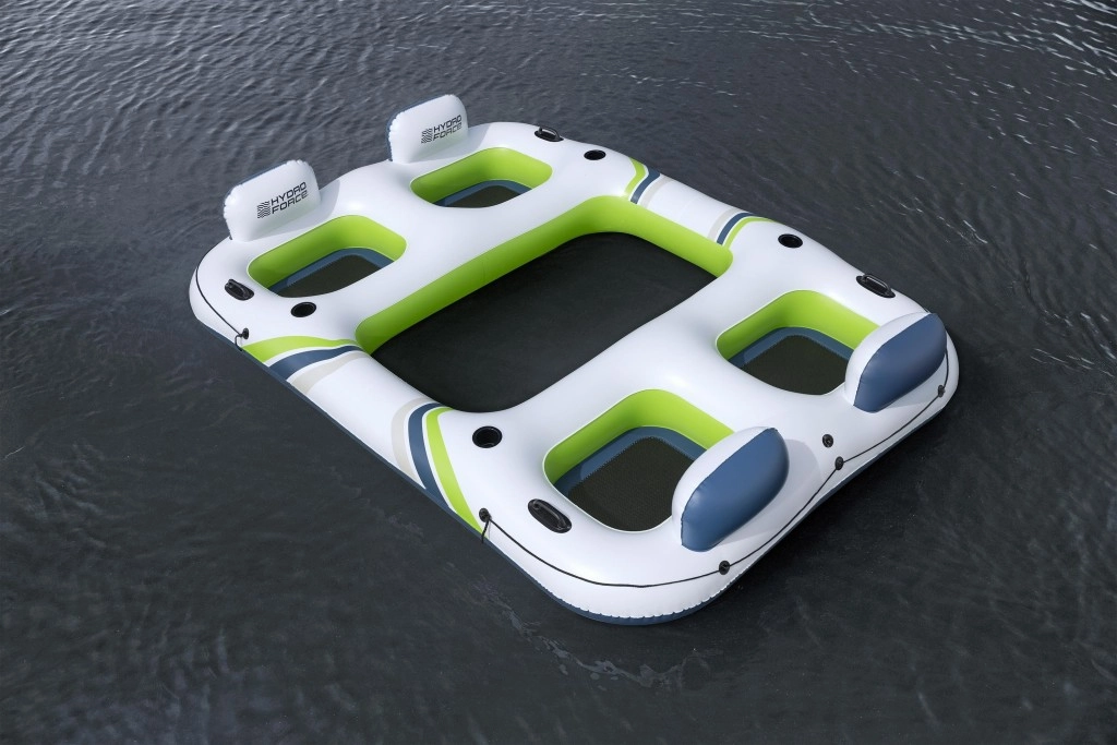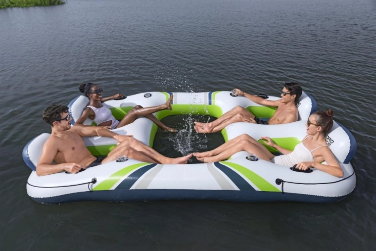 Genießen Sie perfekte Entspannung auf dem Wasser mit der geräumigen Insel für vier Personen. Dank des Materials Inflata‑Shield™ bietet sie höhere Durchstichfestigkeit, stabile Konstruktion und exzellente Luftdichtigkeit. Vier gepolsterte Rückenlehnen, Netzsitzflächen zur Kühlung der Füße, Getränkehalter und praktische Griffe sorgen für Komfort und Sicherheit. Das Clasp ’N Go™-System ermöglicht ein einfaches Verbinden mit weiteren Schwimmkörpern. Tragfähigkeit bis zu 400 kg.