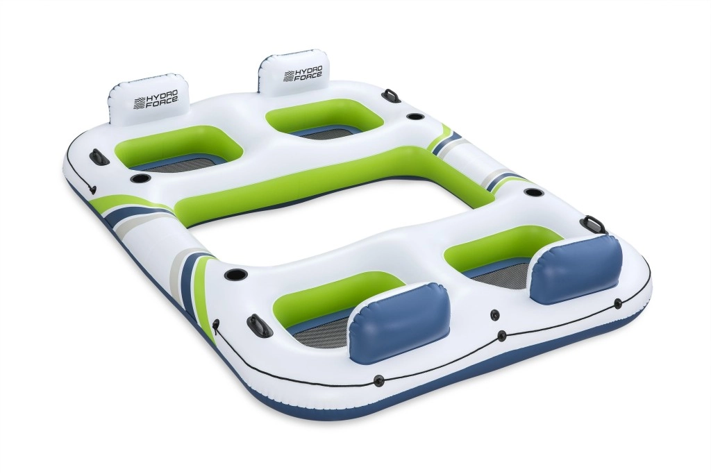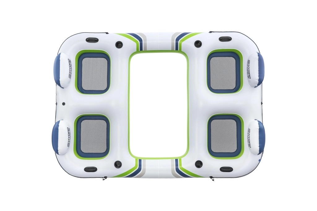 Die große aufblasbare HYDRO‑FORCE Insel ist ideal zum Relaxen am See, am Meer oder im Pool. Vier ergonomische Sitze mit Netz kühlen die Füße angenehm, und eine zentrale Öffnung ermöglicht jederzeit Erfrischung. Dank mehrerer Luftkammern, stabiler Griffe und eines umlaufenden Seils sind Einsteigen und Handhabung im Wasser einfach und sicher.