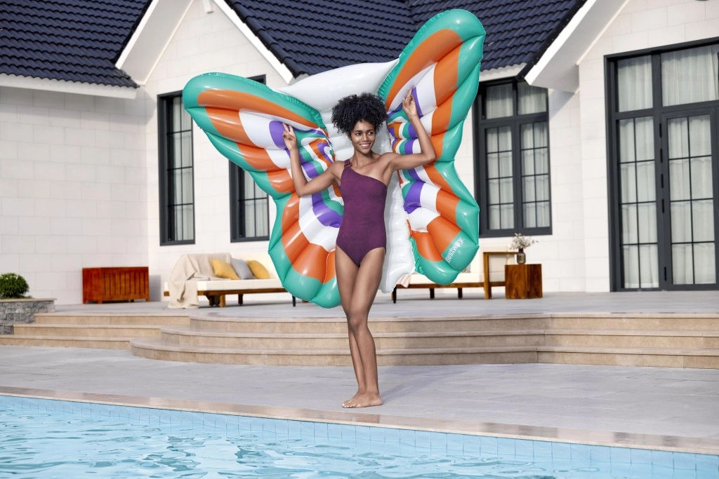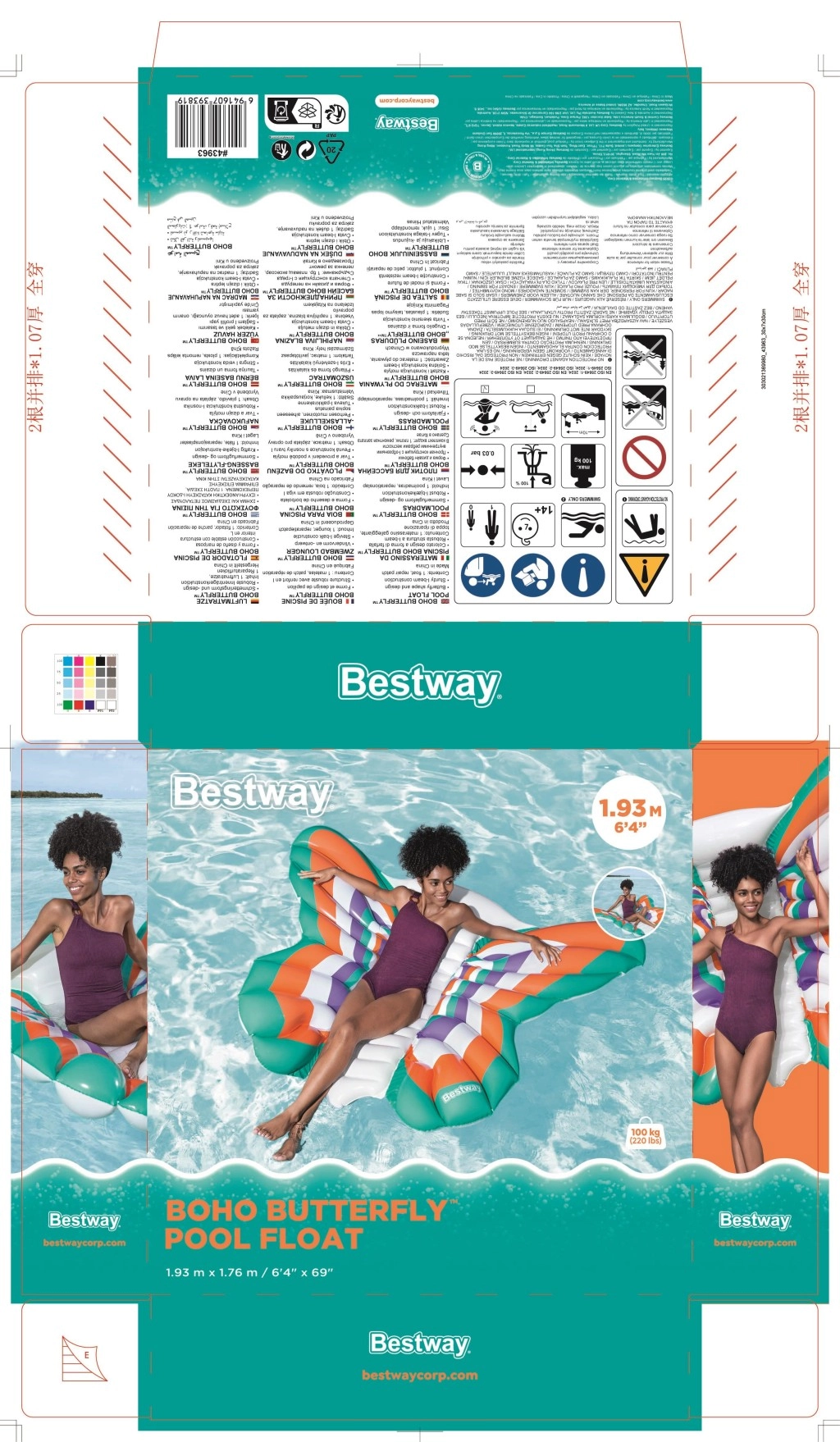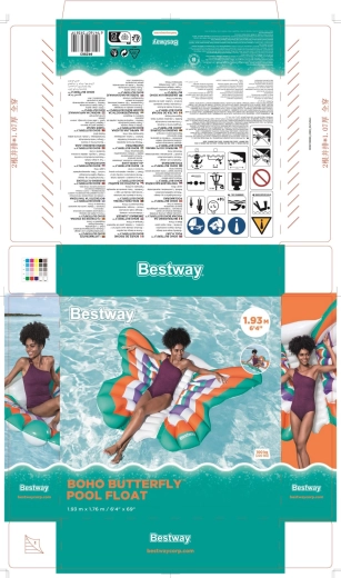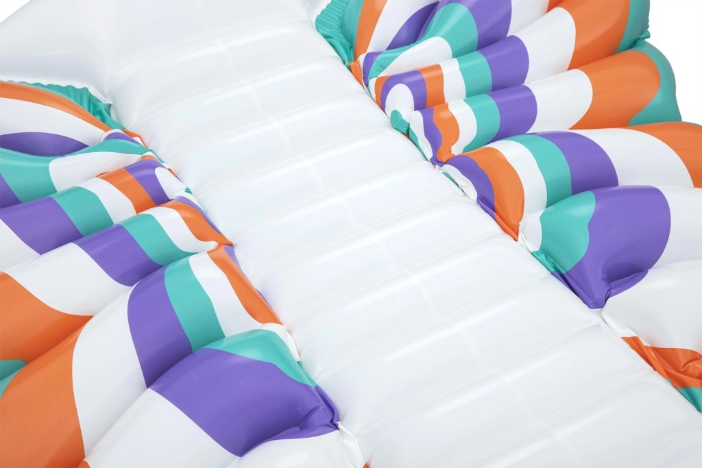 Diese stylische aufblasbare Matratze im Design von Schmetterlingsflfcgeln bietet eine gelungene Kombination aus Komfort und Spadf. Farbige Paneele in Orange, Tfcrkis, Violett und Weidf sorgen ffcr einen auffe4lligen Look, we4hrend der gerippte Mittelstreifen eine bequeme Rfcckenstfctze und eine entspannte Position auf dem Wasser bietet.