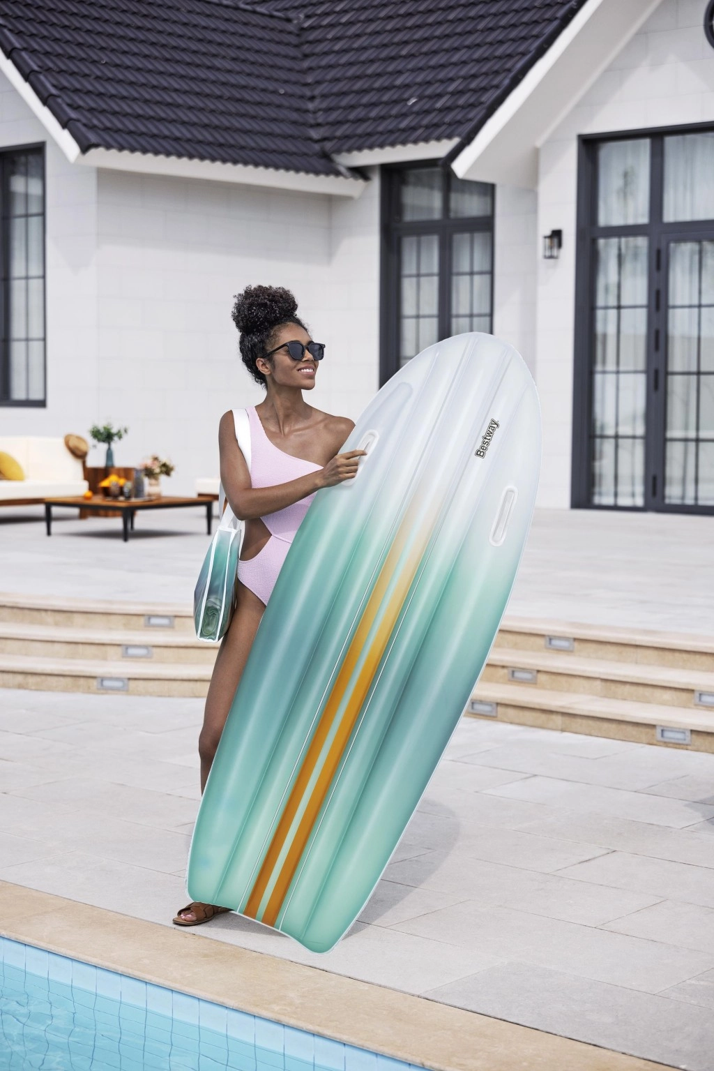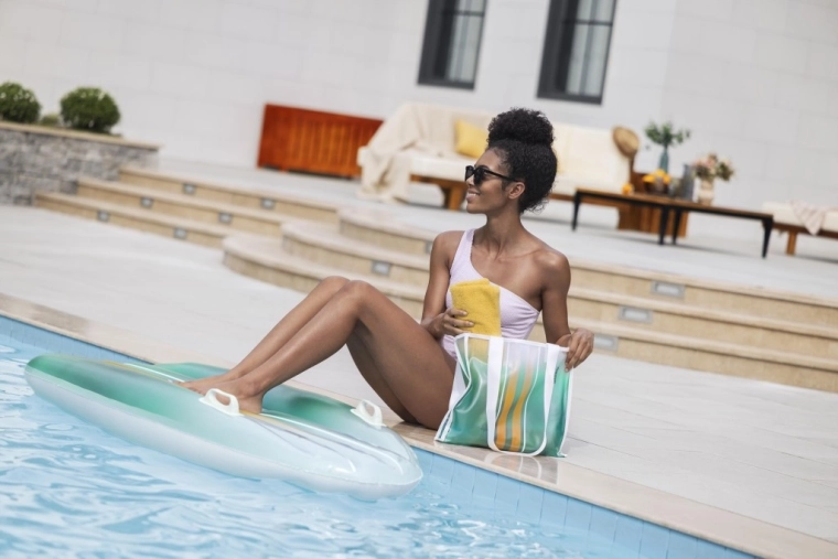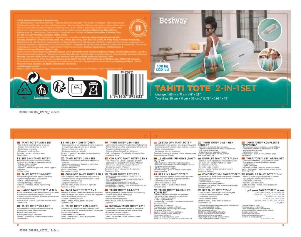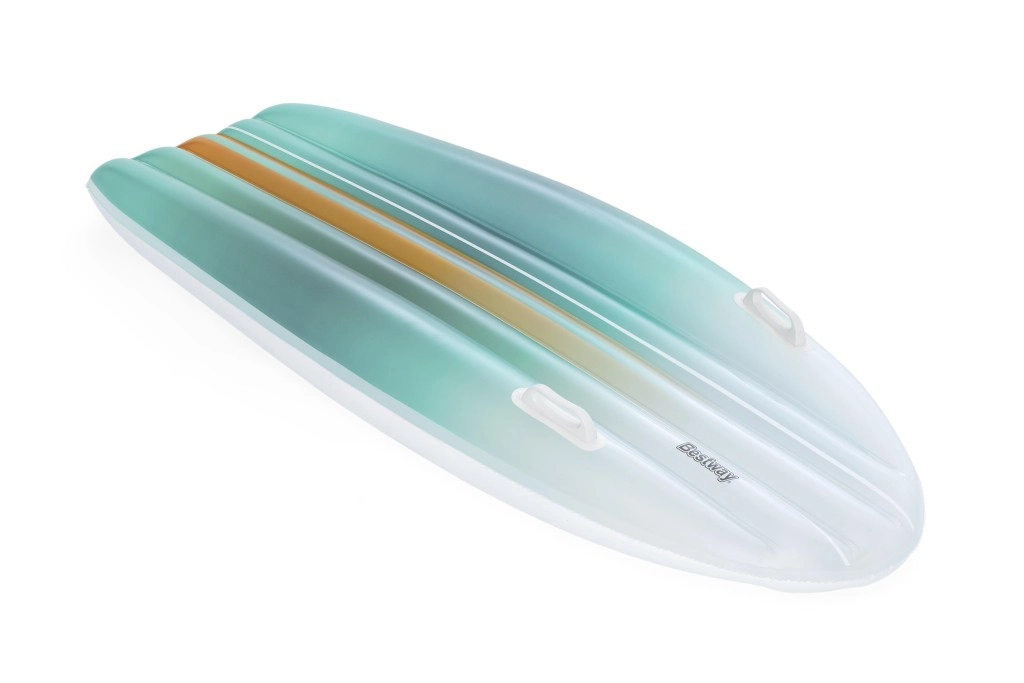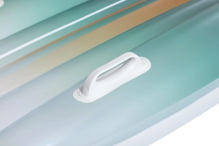 Das BESTWAY TAHITI Set vereint Praktikabilität und Stil für entspannte Stunden am Wasser. Die Liege mit hydrodynamischer Form und zwei integrierten Griffen sorgt für Sicherheit beim Aufsteigen und während der Ruhepause. Der einheitliche cyanfarbene Farbverlauf-Print auf Liege und Tasche wirkt frisch und sommerlich – ein Blickfang am Pool und Strand.