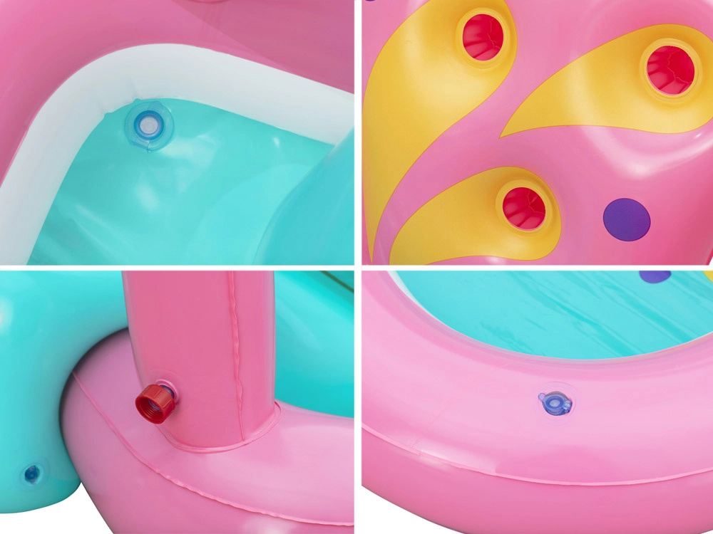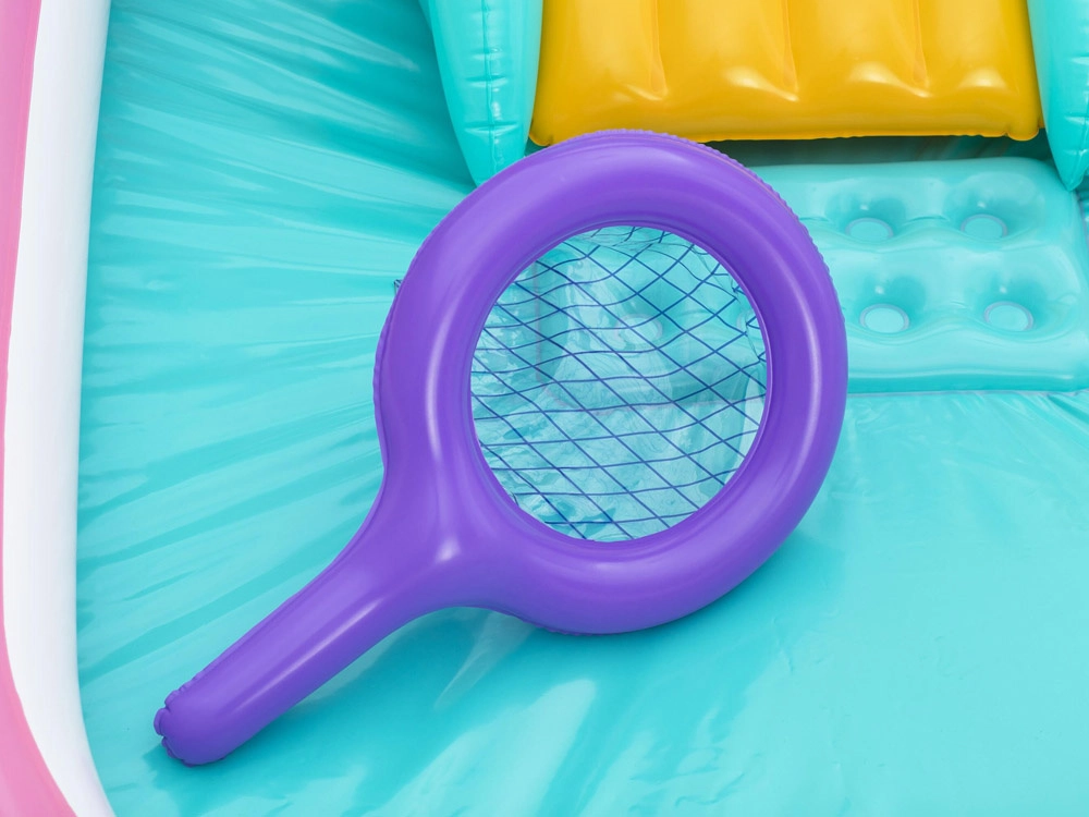 Dazu kommen lustige schwimmende Spielzeuge und aufblasbare Elemente in Schmetterlings- und Ringform. Weiche Wände und gepolsterte Landungen erhöhen Komfort und Sicherheit. Das strapazierfähige Vinyl ist leicht zu reinigen, und das beiliegende Reparaturflicken verlängert die Lebensdauer. Einfach Schlauch anschließen, aufpumpen – und der Spaß kann beginnen.