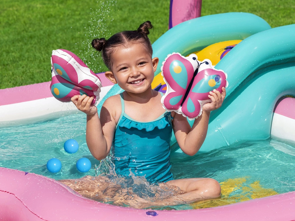 Macht sonnige Tage noch schöner mit dem Bestway Schmetterling Spielcenter – einem niedlichen, sicheren und unterhaltsamen Wasserspielplatz für Kinder ab 2 Jahren. Es bietet eine weiche Rutsche, einen bogenförmigen Sprüher für sanfte Erfrischung sowie interaktive Öffnungen zum Sortieren von Bällen. Das bunte pastellfarbene Design und aufblasbare Accessoires fördern Bewegung, Koordination und kreatives Spiel im Garten.
