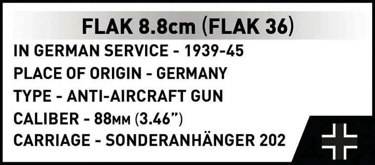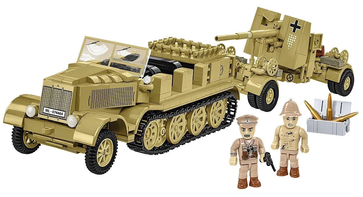 Enthalten sind 2 Artilleristen-Figuren in Wüstenuniformen (inklusive Tropenhelm), bewegliche Mechanismen des Geschützes (drehbare Lafette, verstellbares Rohr) sowie realistische Ketten und das Fahrwerk des Zugwagens. Dazu kommen eine Munitionskiste, ein Schild mit Maßstabangabe und gut lesbare bildliche Anleitungen. Der Bausatz ist mit anderen Marken kompatibel und erfüllt Sicherheitsnormen.