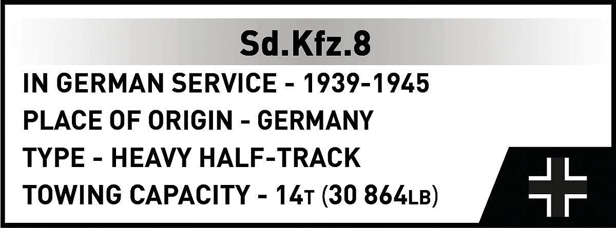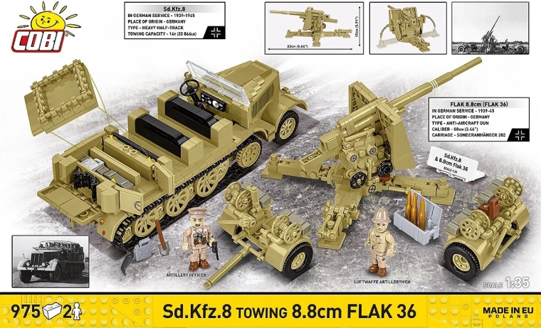 Bauen Sie die ikonische DAK-Kombination der Wüstenartillerie: der robuste Halbkettenzugwagen Sd.Kfz. 8 mit gezogener 8,8 cm Flak 36. Sie erhalten ein realistisches Modell im Maßstab 1:35, 975 Teilen, 2 Figuren und vielen beweglichen Elementen für Actionszenarien und Dioramen aus dem Feldzug in Nordafrika. Hochwertige Verarbeitung, dauerhafte Drucke und eine intuitive Anleitung begeistern Sammler wie auch begeisterte Baumeister.