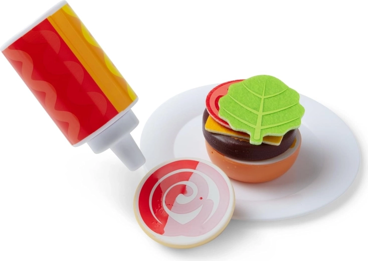 Filzbeilagen und Brötchen zeigen nach dem Befeuchten Ketchup und Senf. Die Speisen können sortiert, serviert und in Textiltragetaschen verstaut werden – für noch mehr Rollenspiel.
