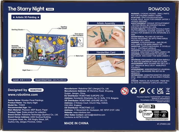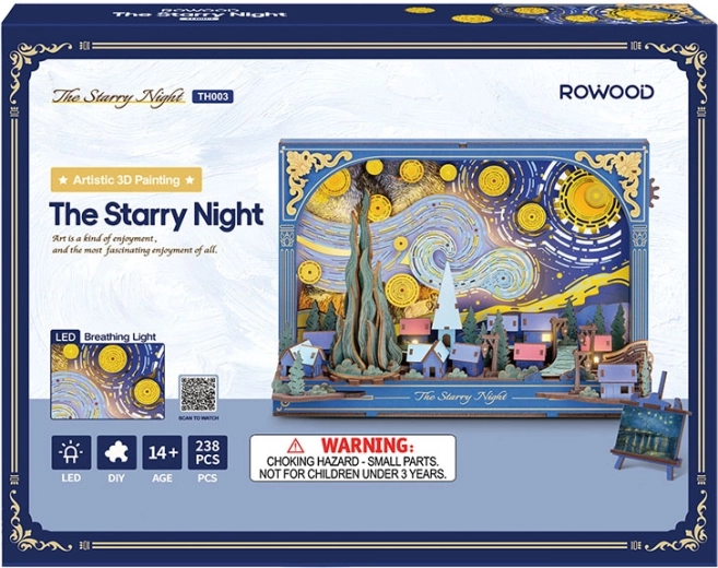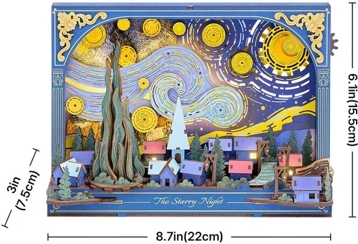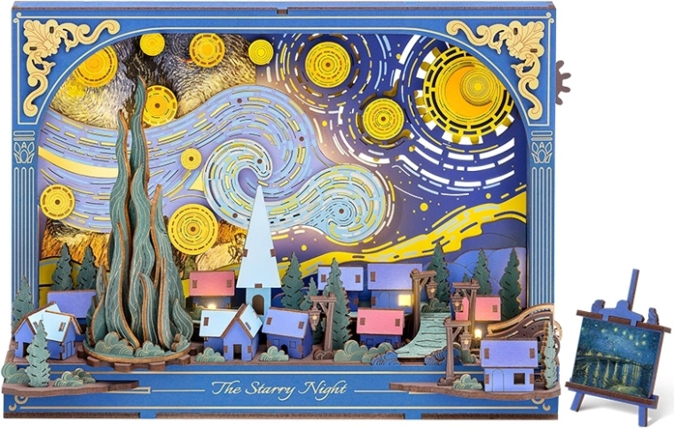 Entdecken Sie den Zauber des berühmten Motivs mit dem einzigartigen 3D-Puzzle RoboTime Sternennacht, das sich nach dem Zusammenbau in eine stilvolle Dekoration mit sanfter LED-Hintergrundbeleuchtung verwandelt. Dank 238 Teilen, einfacher Montage ohne Klebstoff und auswechselbarem Hintergrund erschaffen Sie eine eindrucksvolle Szene mit beweglichen Details – Sternen, Mond, Zypresse und einem Wagenrad. Ideal als Nachtlampe, Geschenk und designstarke Wohndekoration.