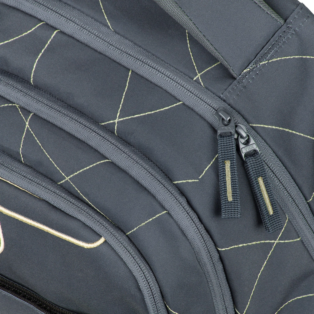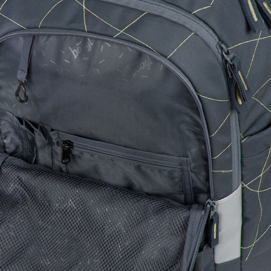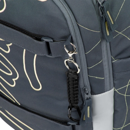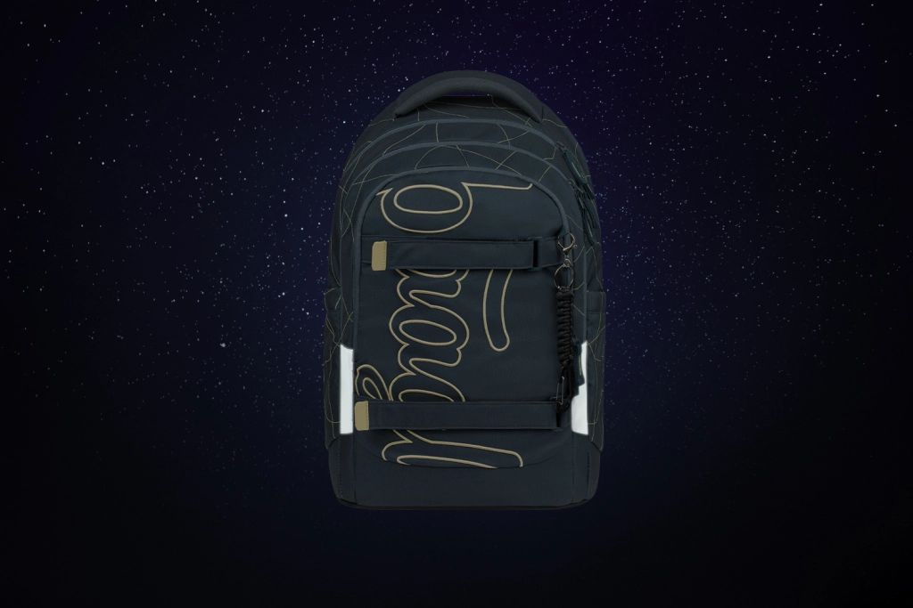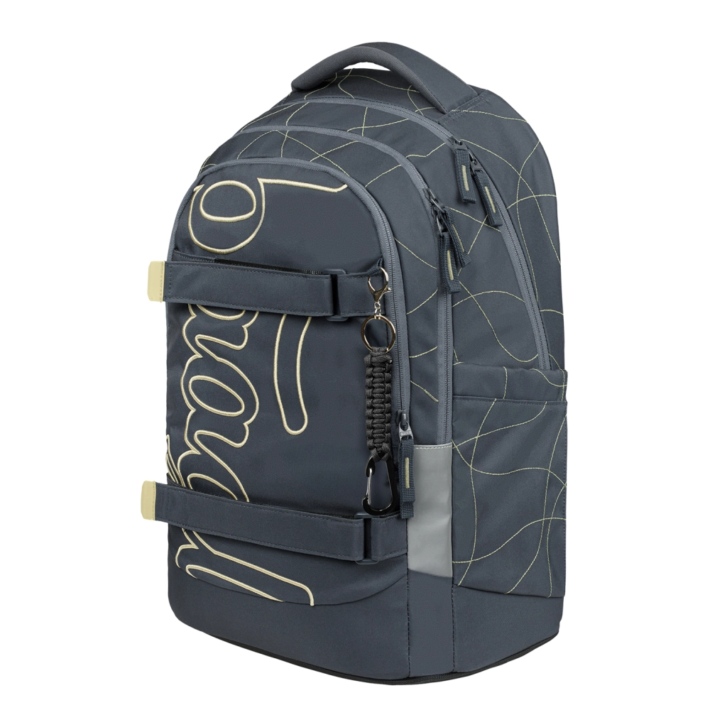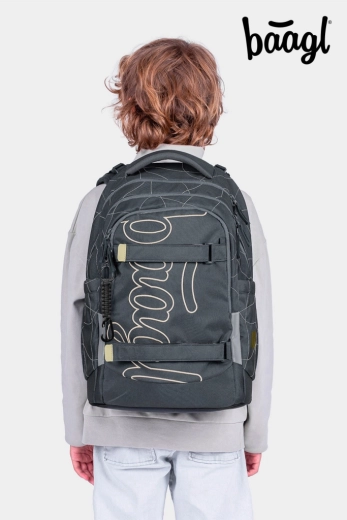 Im Inneren bietet ein Drei-Fächer-Organizer eine samtige Laptop-Tasche, die Elektronik vor Kratzern schützt. Stabile Seitentaschen fassen BAAGL-Trinkflaschen aus Tritan, die vordere Kompression fixiert einen Hoodie oder ein Skateboard und der stylische Anhänger verleiht dem Rucksack eine individuelle Note.
