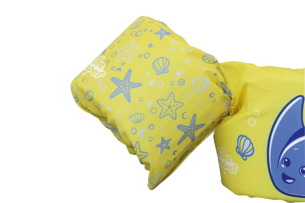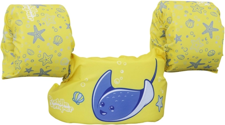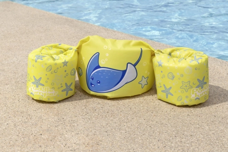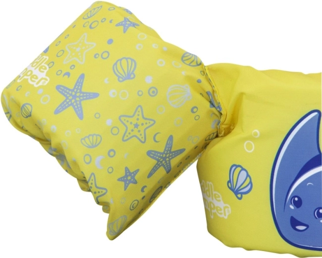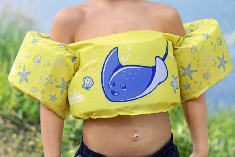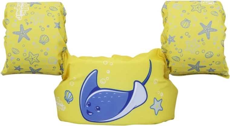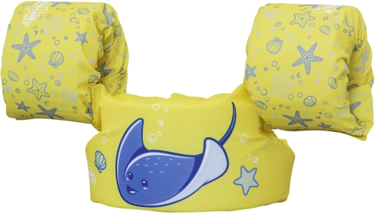 Diese Kinder-Schwimmweste mit integrierten Ärmeln kombiniert den Komfort von weichem Polyester mit sicherem Auftrieb dank hochwertiger Schaumeinlagen. Das leuchtend gelbe Design mit blauem Rochen und maritimen Motiven erhöht die Sichtbarkeit des Kindes im Wasser und lädt spielerisch zu Wasserspaß ein.