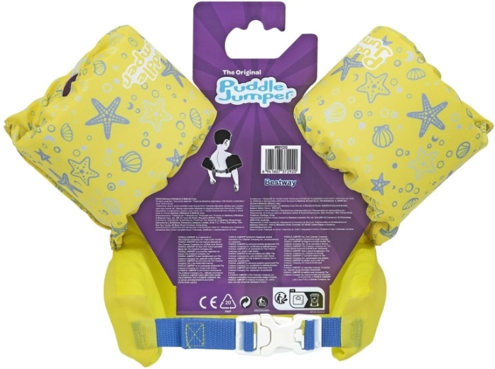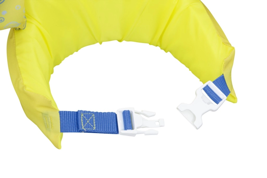 Die Ärmel umschließen die Arme fest und stabilisieren die Position des Kindes, während die rückseitige Schnalle mit verstellbarem Gurt einen sicheren, gegen Aufspringen geschützten Sitz gewährleistet. Die Weste ist leicht, einfach zu transportieren und widerstandsfähig gegen Wasser und Sonne – ideal für Urlaub, Gartenpool und Freibad.