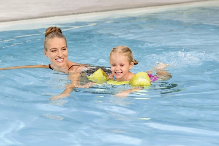 Integrierte Ärmel und ein gepolsterter Brustbereich helfen, die richtige Körperhaltung zu halten und Selbstvertrauen beim Schwimmenlernen aufzubauen.