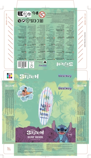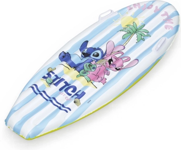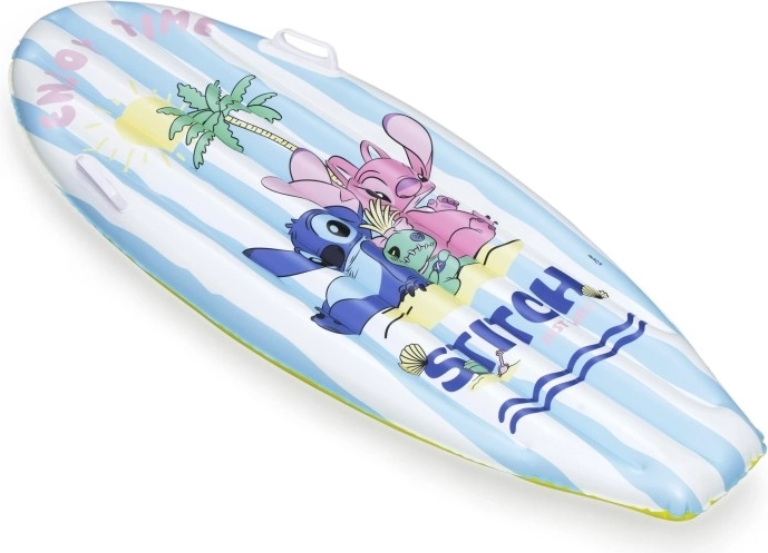 Das aufblasbare Surf-Board mit DISNEY Stitch begeistert Kinder mit fröhlicher Grafik mit Palmen, Sonne und Muscheln. Blau-weiße Streifen auf der Oberseite und ein gelber Boden erhöhen die Sichtbarkeit auf dem Wasser, während das geringe Gewicht das Tragen und Handling erleichtert.