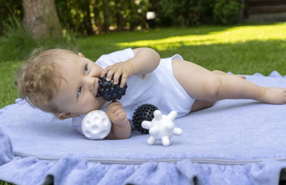 Ideal für sanfte Massage von Handflächen und Fußsohlen, für erste Spiele auf der Krabbelmatte und als Ergänzung für den Montessori‑Korb. Dank der leichten und weichen Konstruktion eignen sich die Bälle für den täglichen Einsatz zu Hause und unterwegs.