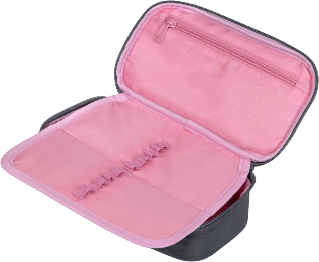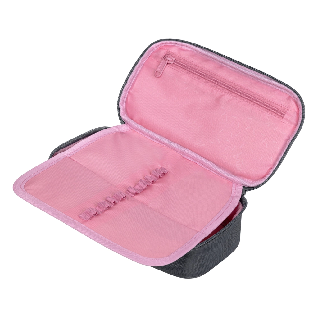 Praktisches BAAGL-Etui in elegantem Dunkelgrau mit rosa Logo, das modernes Design und clevere Aufteilung kombiniert. Die Hauptkammer bietet ausreichend Platz für Schreibutensilien und Kleinigkeiten, während die doppelte Klappflappe mit elastischen Schlaufen alles übersichtlich an Ort und Stelle hält. Ein Innenfach und ein transparentes Fenster für den Stundenplan erleichtern die schnelle Orientierung im Schulalltag.