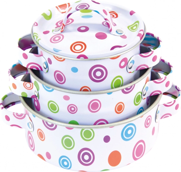 Stilvolles Kinder-Kochgeschirr aus Metall für kleine Köchinnen und Köche bringt realitätsnahes Kochspiel nach drinnen und draußen. Enthält 3 Töpfe mit Deckeln, Pfanne, Schöpflöffel, Sieb, Pfannenwender und Topflappen. Robuste Ausführung, buntes Punktmuster und 11 praktische Teile regen die Fantasie an und fördern die Feinmotorik.