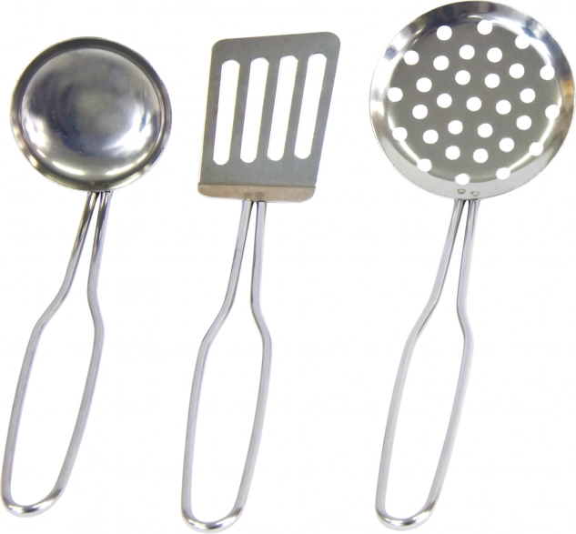 Schöpflöffel, Sieb, Pfannenwender und Topflappen ermöglichen Kindern, alle Kochaufgaben im Spiel zu meistern.