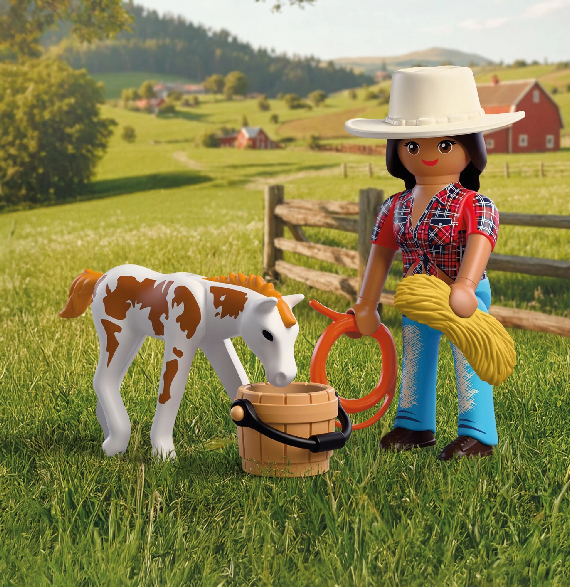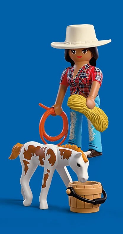 Im Lieferumfang enthalten sind eine Reiterinnen-Figur (ca. 7,5 cm), ein Fohlen, ein Lasso, ein Cowboyhut, ein Wassereimer und ein Heuballen. Das Set lässt sich mit weiteren PLAYMOBIL-Sets kombinieren, was die Spielmöglichkeiten erweitert und für langanhaltenden Spielspaß sorgt.