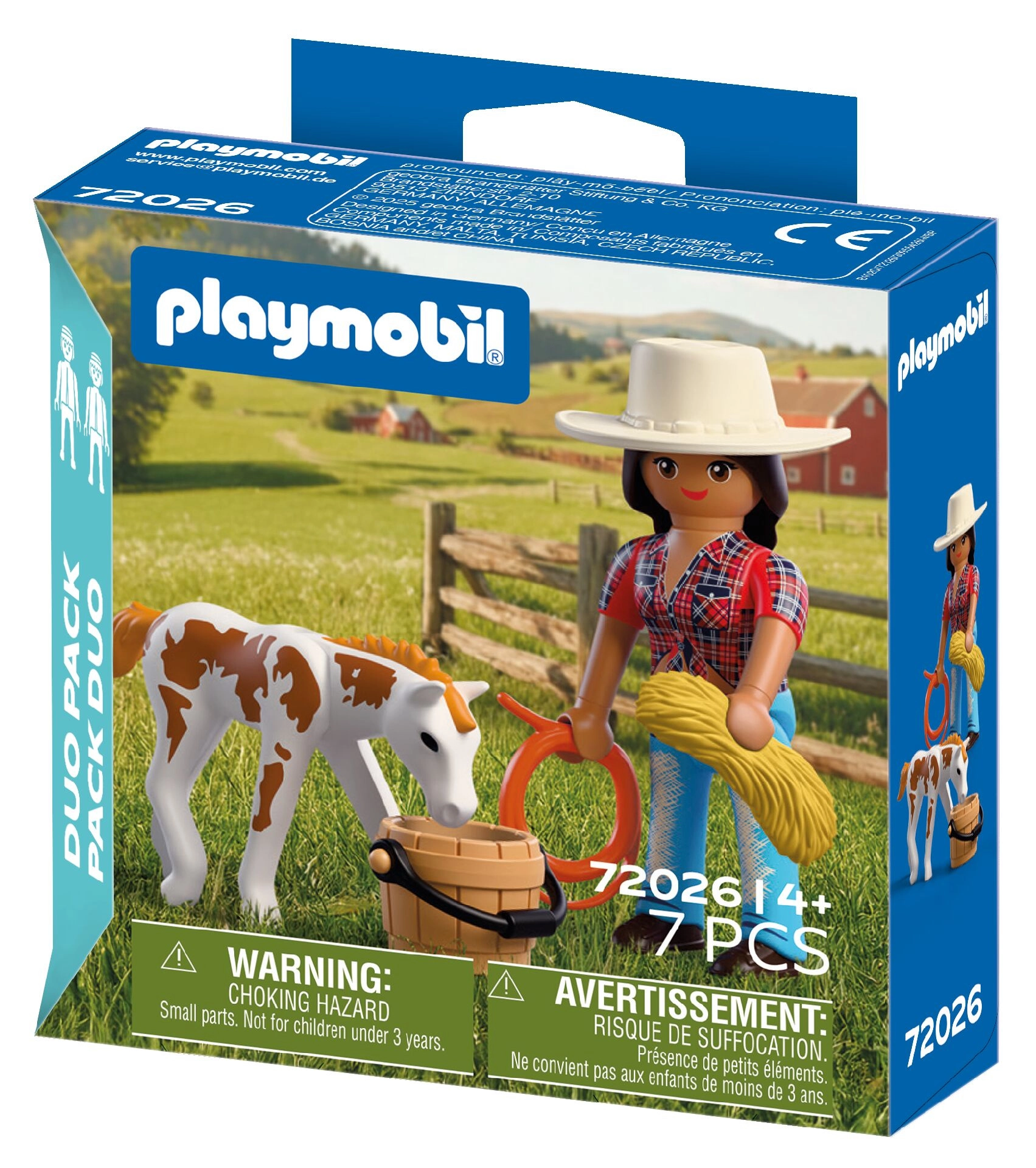 Entdecken Sie das unterhaltsame Set PLAYMOBIL Duo Pack mit einer Cowgirl-Figur und einem niedlichen Appaloosa-Fohlen. Ideal für kreatives Spielen und die Förderung der Fantasie, mit praktischen Zubehörteilen wie Lasso, Eimer und Heu. Eine tolle Erweiterung der PLAYMOBIL-Welt für Kinder ab 4 Jahren.