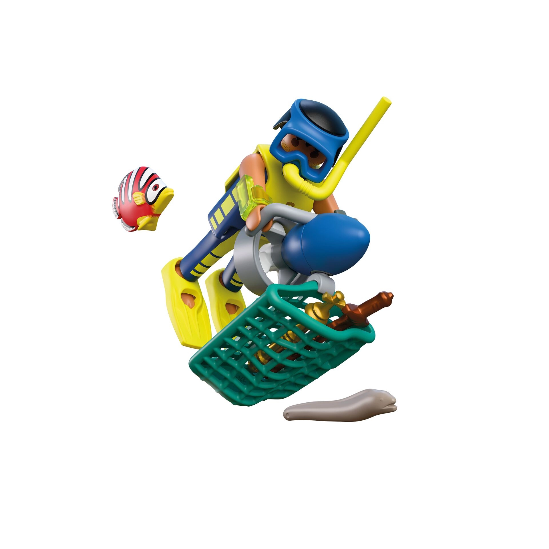 Masken, Flossen, Sauerstoffflasche und der Unterwasserscooter fördern kreatives Spiel; der Korb ermöglicht das Einsammeln von Funden und das Erschaffen neuer Missionen.