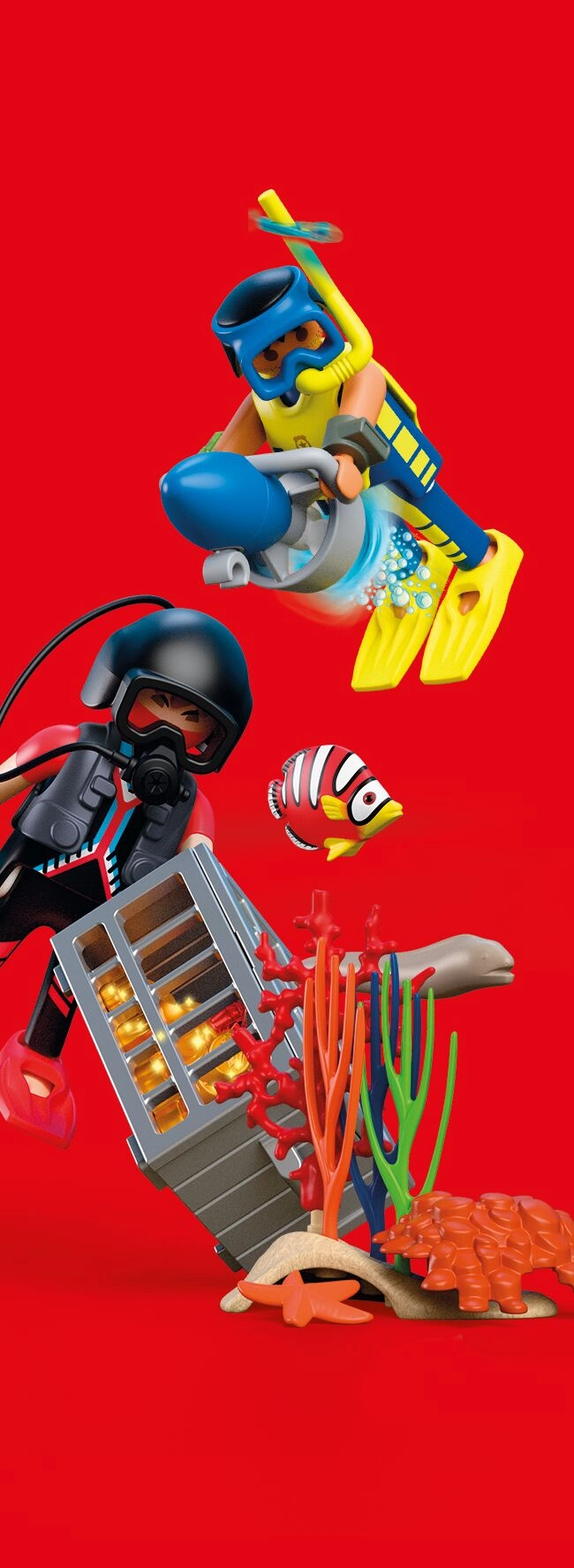 Dieses Set bietet eine actiongeladene Verfolgungsjagd in den Tiefen des Meeres: Ein wachsamer Polizeitaucher verfolgt einen Dieb, der versucht, die Schatzkiste zwischen Algen und Korallen zu verstecken. Dank Unterwasserscooter, Ausrüstung und realistischen Accessoires warten viele spannende Missionen und freies Erkunden der Unterwasserwelt auf die Kinder.