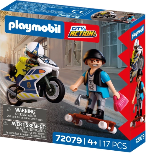 Starten Sie spannende Action in der Stadt mit dem PLAYMOBIL City Action Spielset. Ein Polizist auf dem Motorrad verfolgt einen Dieb auf dem Skateboard und versucht, die gestohlene Handtasche zurückzuholen. Das Set enthält 2 Figuren, ein Polizeimotorrad, einen Longboard/Skateboard und viele authentische Zubehörteile für realistisches Rollenspiel.