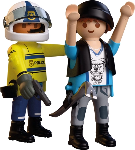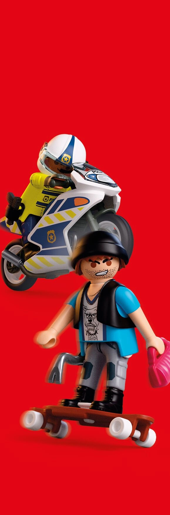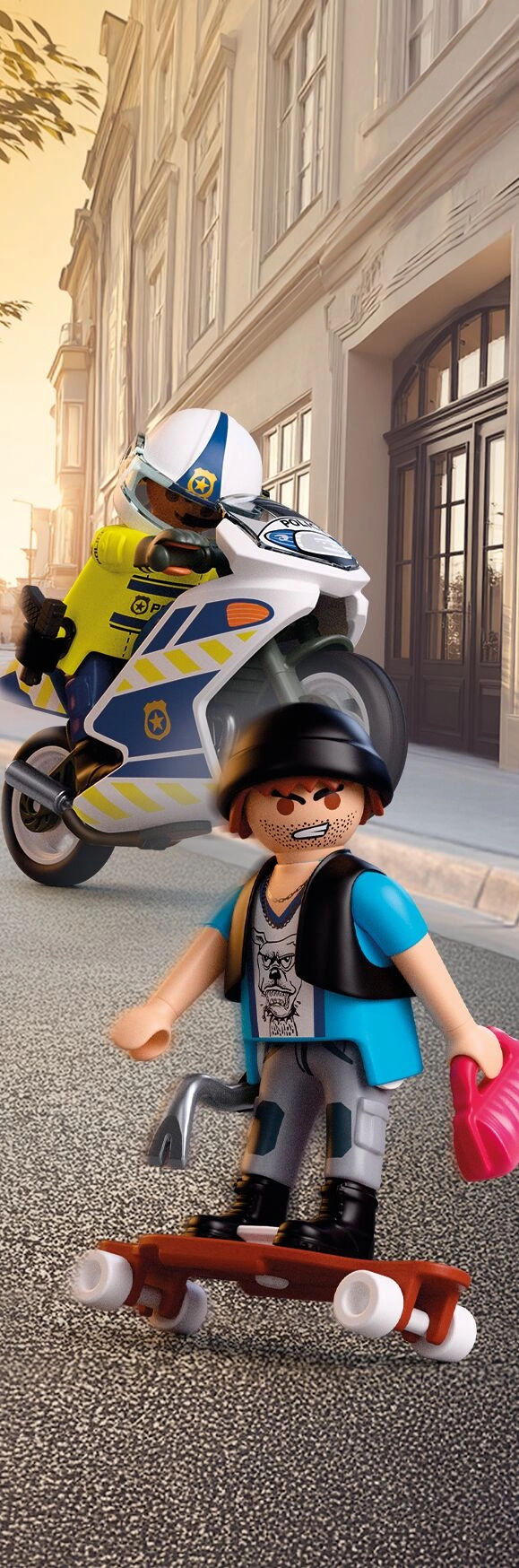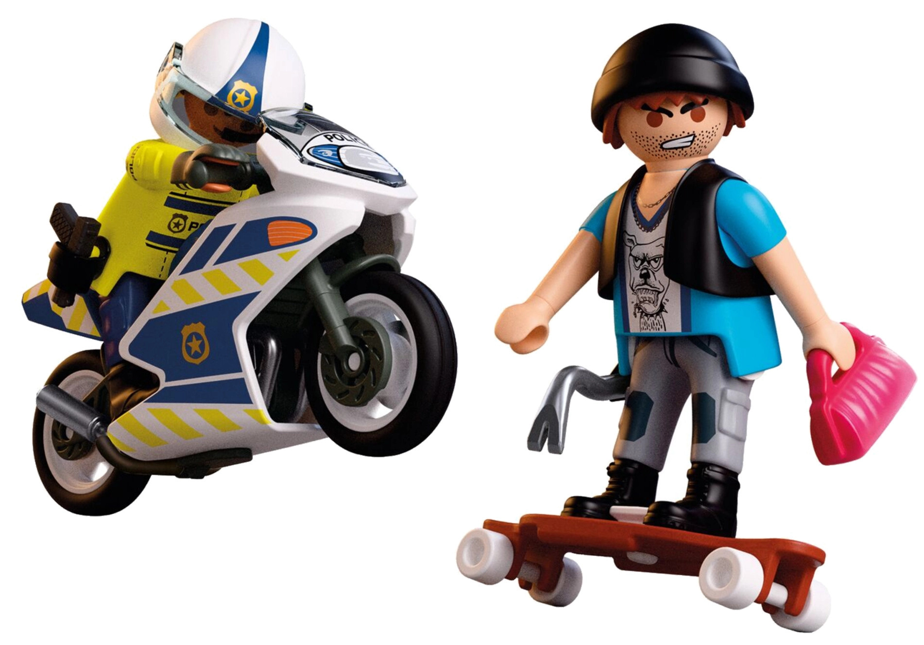 • Set-Inhalt: 2 Figuren (Polizist und Dieb, ca. 7,5 cm), Polizeimotorrad, Skateboard/Longboard, Helm, Handschuhe, Holster, Pistole, Mütze, Handtasche, Halter und Brecheisen.