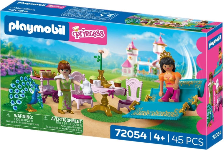 Bezauberndes PLAYMOBIL-Playset für Märchenliebhaber: Zwei Prinzessinnen genießen einen Nachmittagstee im Schlossgarten, sie kommen auf einem fliegenden Teppich an und servieren Köstlichkeiten vom Servierwagen. Enthalten sind außerdem ein elegantes Teeservice, niedliche Cupcakes und ein majestätischer Pfau für noch mehr fantasievolle Geschichten. Das Set bietet umfangreiches Zubehör und fördert kreatives Rollenspiel.